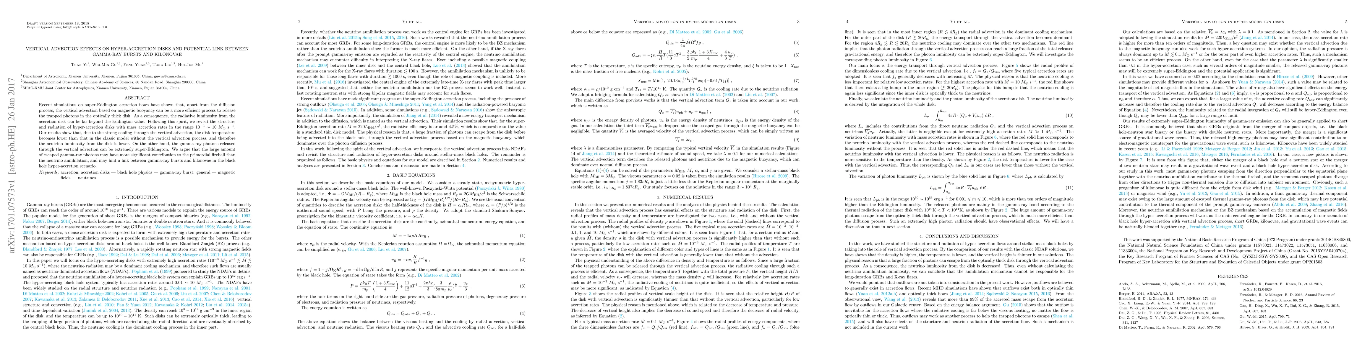 This paper investigates the role of vertical advection in hyper-accretion disks, finding that it efficiently releases trapped photons, leading to super-Eddington luminosity. It suggests a potential connection between gamma-ray bursts and kilonovae, as the large number of gamma-ray photons from vertical advection may contribute significantly to the primordial fireball.