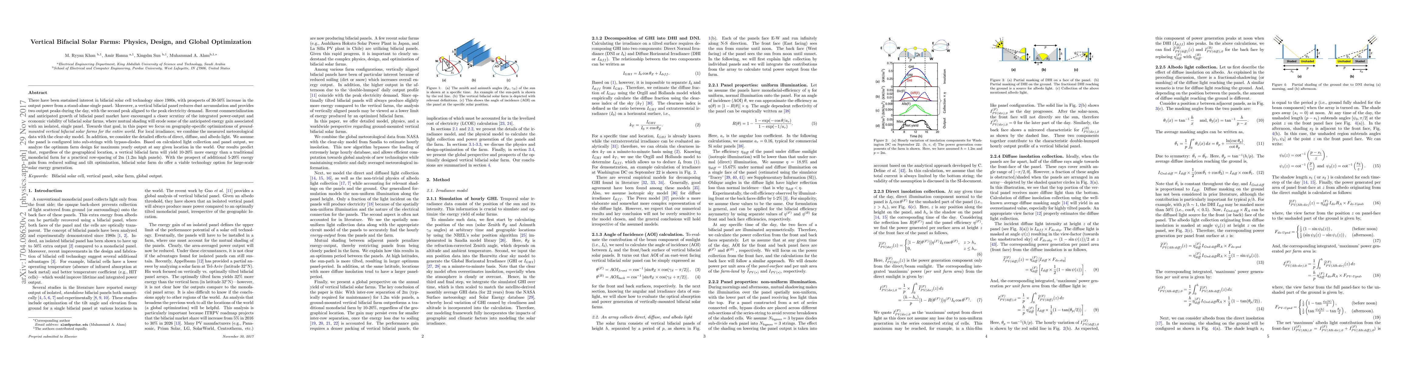 This paper investigates the physics, design, and global optimization of vertical bifacial solar farms, predicting a 10-20% energy gain over traditional monofacial farms due to reduced dust accumulation and dual output peaks. The study combines local irradiance data with clear-sky modeling to determine the optimal farm design for maximum yearly output, suggesting bifacial farms as a viable large-scale solar energy solution.