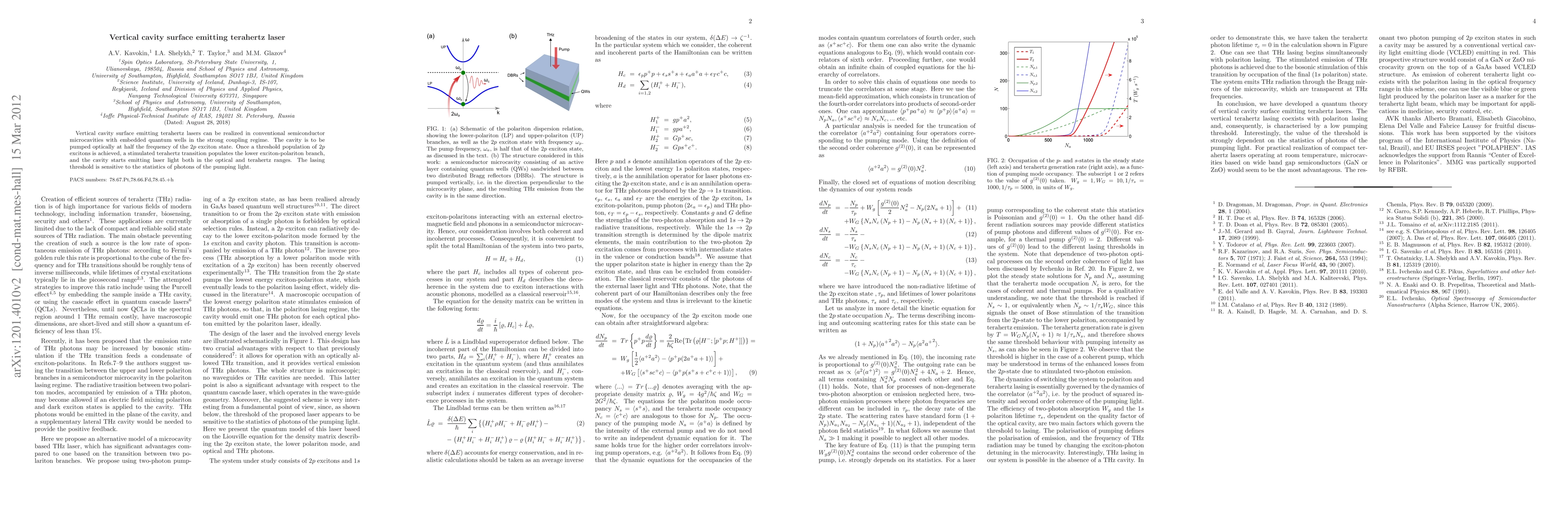 Vertical cavity surface emitting terahertz lasers utilize semiconductor microcavities with quantum wells in a strong coupling regime to achieve lasing in both optical and terahertz ranges when optically pumped at half the frequency of the 2p exciton state. The lasing threshold is influenced by the statistical properties of the pumping light.