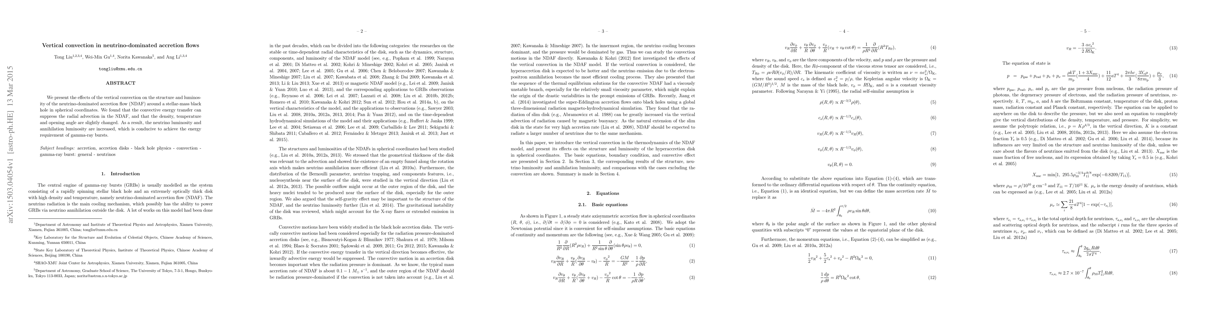 We present the effects of the vertical convection on the structure and luminosity of the neutrino-dominated accretion flow (NDAF) around a stellar-mass black hole in spherical coordinates. We found that the convective energy transfer can suppress the radial advection in the NDAF, and that the density, temperature and opening angle are slightly changed. As a result, the neutrino luminosity and annihilation luminosity are increased, which is conducive to achieve the energy requirement of gamma-ray bursts.