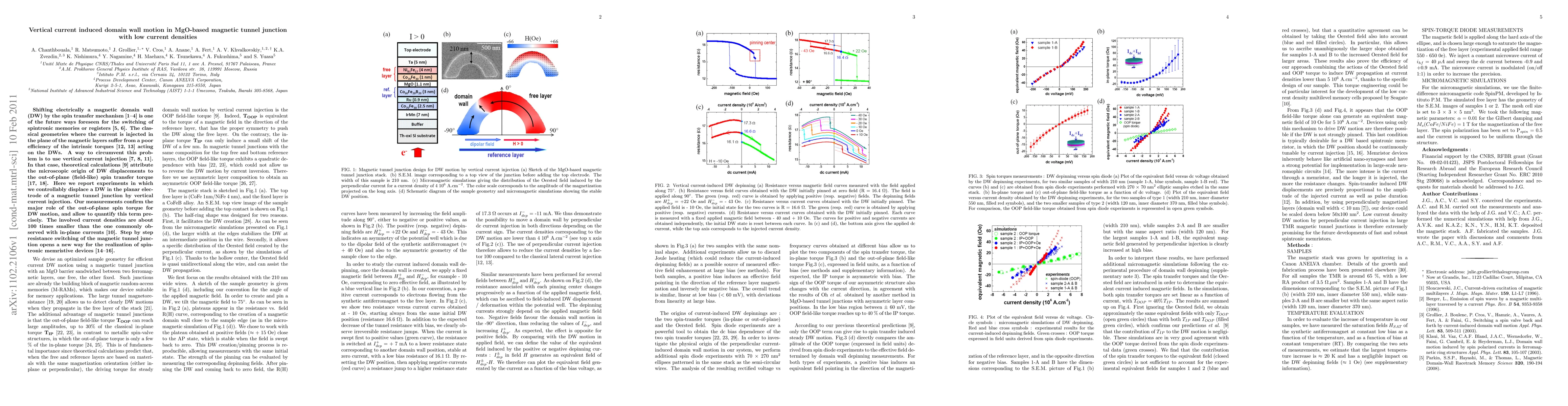 This paper reports on the controlled displacement of a magnetic domain wall in a MgO-based magnetic tunnel junction using vertical current injection, demonstrating the effectiveness of out-of-plane spin transfer torque at significantly lower current densities compared to in-plane methods. The findings suggest a promising approach for spintronic memristive devices.