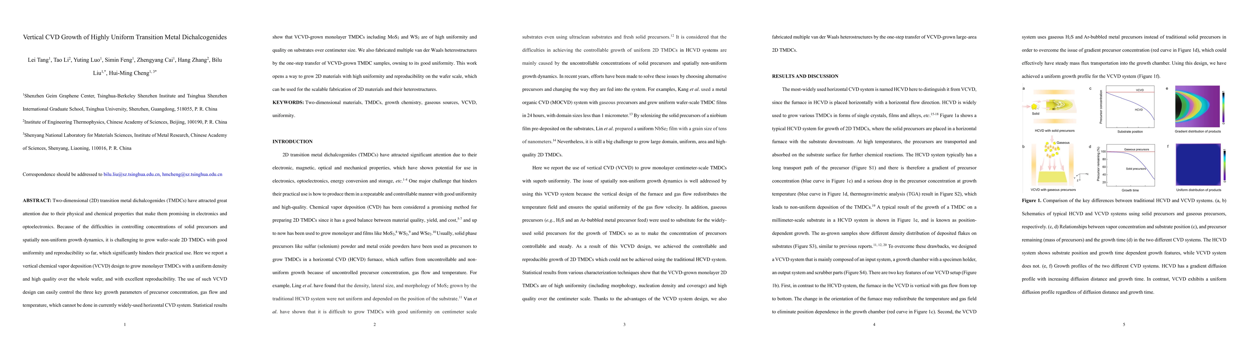 Two-dimensional (2D) transition metal dichalcogenides (TMDCs) have attracted great attention due to their physical and chemical properties that make them promising in electronics and optoelectronics. Because of the difficulties in controlling concentrations of solid precursors and spatially non-uniform growth dynamics, it is challenging to grow wafer-scale 2D TMDCs with good uniformity and reproducibility so far, which significantly hinders their practical use. Here we report a vertical chemical vapor deposition (VCVD) design to grow monolayer TMDCs with a uniform density and high quality over the whole wafer, and with excellent reproducibility. The use of such VCVD design can easily control the three key growth parameters of precursor concentration, gas flow and temperature, which cannot be done in currently widely-used horizontal CVD system. Statistical results show that VCVD-grown monolayer TMDCs including MoS2 and WS2 are of high uniformity and quality on substrates over centimeter size. We also fabricated multiple van der Waals heterostructures by the one-step transfer of VCVD-grown TMDC samples, owning to its good uniformity. This work opens a way to grow 2D materials with high uniformity and reproducibility on the wafer scale, which can be used for the scalable fabrication of 2D materials and their heterostructures.