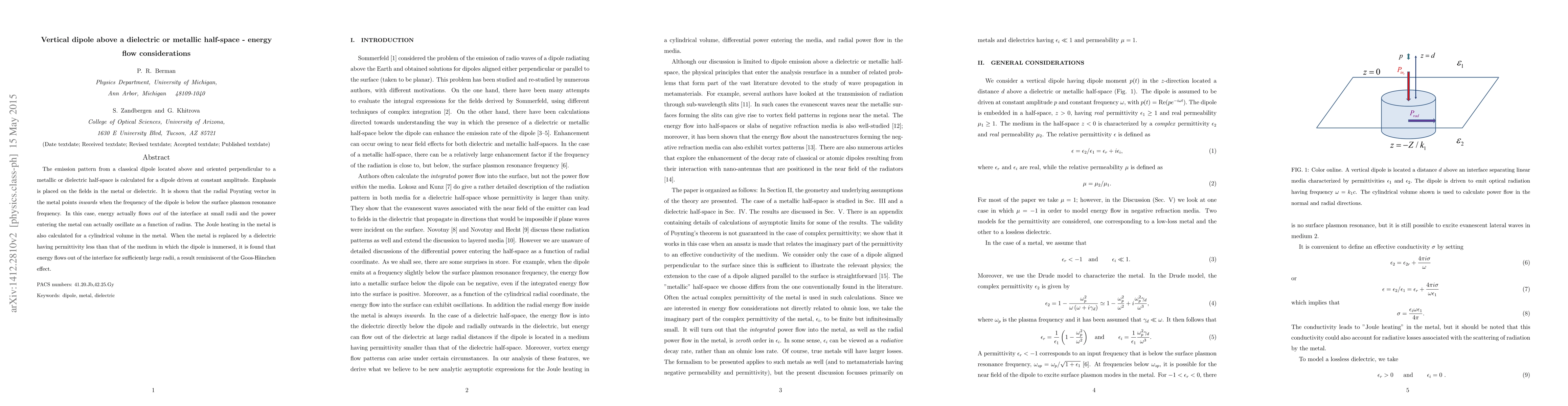 This paper investigates the energy flow from a vertical dipole above a metallic or dielectric half-space, revealing that below the surface plasmon resonance frequency, energy flows inwards in the metal, while for dielectrics with lower permittivity, energy flows outwards at large radii. The study confirms Poynting's theorem and calculates Joule heating in the metal.