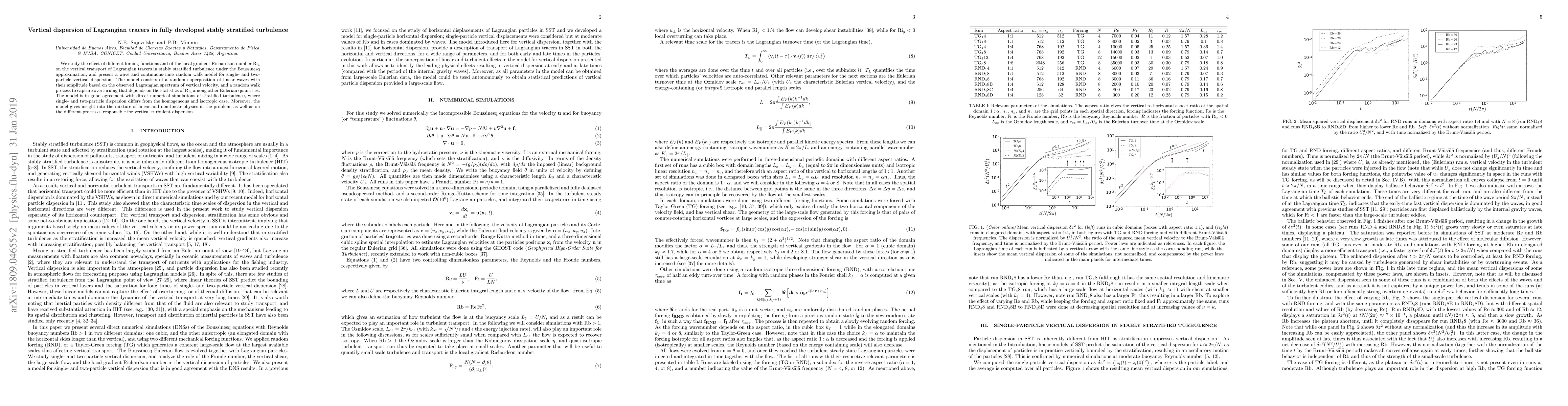 This paper investigates the vertical dispersion of Lagrangian tracers in stably stratified turbulence, focusing on the influence of forcing functions and local gradient Richardson number. It proposes a wave and continuous-time random walk model that accurately captures single- and two-particle dispersion, providing insights into the interplay of linear and non-linear dynamics in turbulent dispersion.