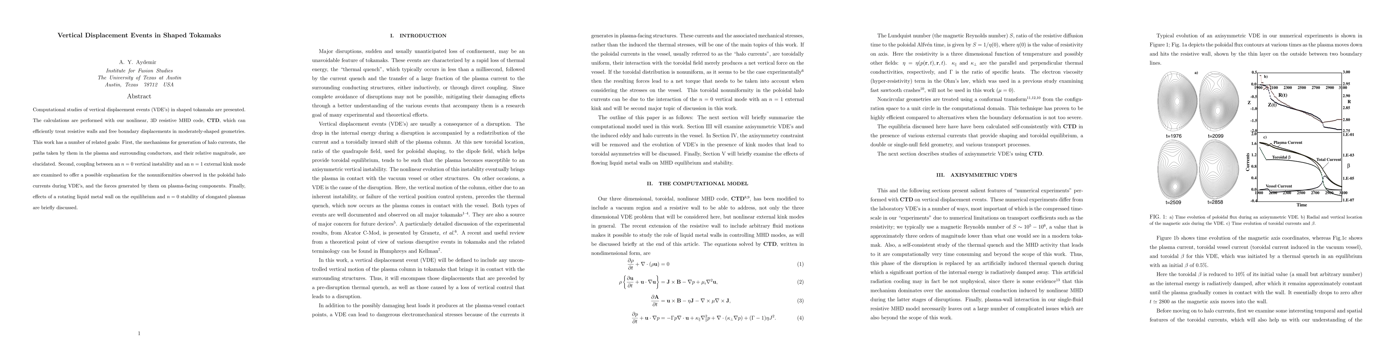 This paper explores vertical displacement events (VDEs) in shaped tokamaks using a nonlinear 3D resistive MHD code, focusing on halo current generation, the coupling between vertical instabilities and external kink modes, and the influence of a rotating liquid metal wall on plasma equilibrium and stability.
