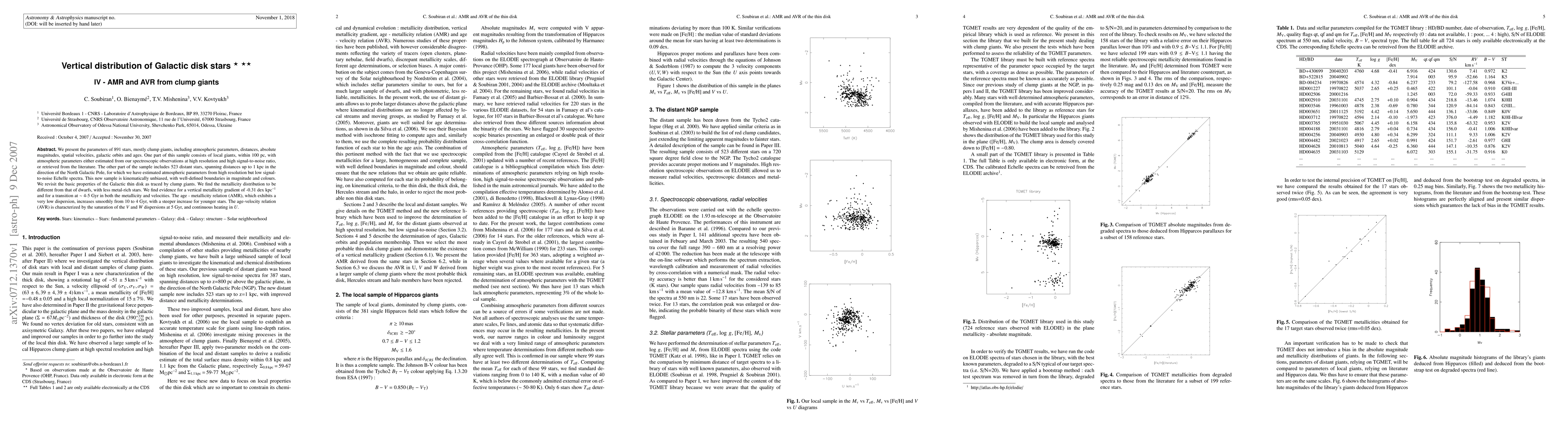 This paper analyzes 891 clump giant stars to study the vertical distribution in the Galactic disk, finding a distinct metallicity gradient and a transition in metallicity and velocities at 4-5 Gyr. The age-metallicity relation (AMR) shows a smooth increase, while the age-velocity relation (AVR) indicates saturation in V and W dispersions at 5 Gyr with ongoing heating in U.