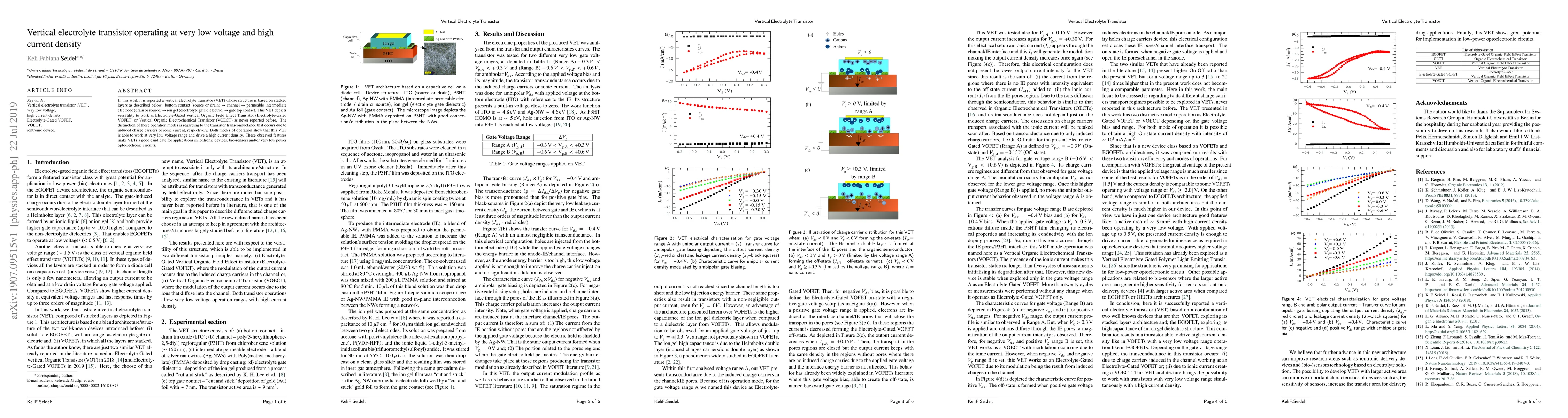 This paper presents a vertical electrolyte transistor (VET) capable of operating at very low voltages and high current densities, functioning as either an Electrolyte-Gated Vertical Organic Field Effect Transistor (Electrolyte-Gated VOFET) or a Vertical Organic Electrochemical Transistor (VOECT). The VET's versatility and performance make it a promising candidate for iontronic devices, bio-sensors, and low power optoelectronic circuits.