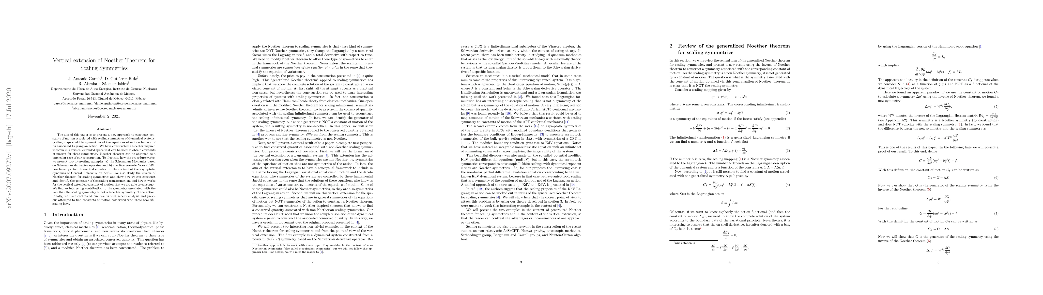 The aim of this paper is to present a new approach to construct constants of motion associated with scaling symmetries of dynamical systems. Scaling maps could be symmetries of the equations of motion but not of its associated Lagrangian action. We have constructed a Noether inspired theorem in a vertical extended space that can be used to obtain constants of motion for these symmetries. Noether theorem can be obtained as a particular case of our construction. To illustrate how the procedure works, we present two interesting examples, a) the Schwarzian Mechanics based on Schwarzian derivative operator and b) the Korteweg-de Vries (KdV) non linear partial differential equation in the context of the asymptotic dynamics of General Relativity on AdS$_3$. We also study the inverse of Noether theorem for scaling symmetries and show how we can construct and identify the generator of the scaling transformation, and how it works for the vertical extended constant of motion that we are able to construct. We find an interesting contribution to the symmetry associated with the fact that the scaling symmetry is not a Noether symmetry of the action. Finally, we have contrasted our results with recent analysis and previous attempts to find constants of motion associated with these beautiful scaling laws.