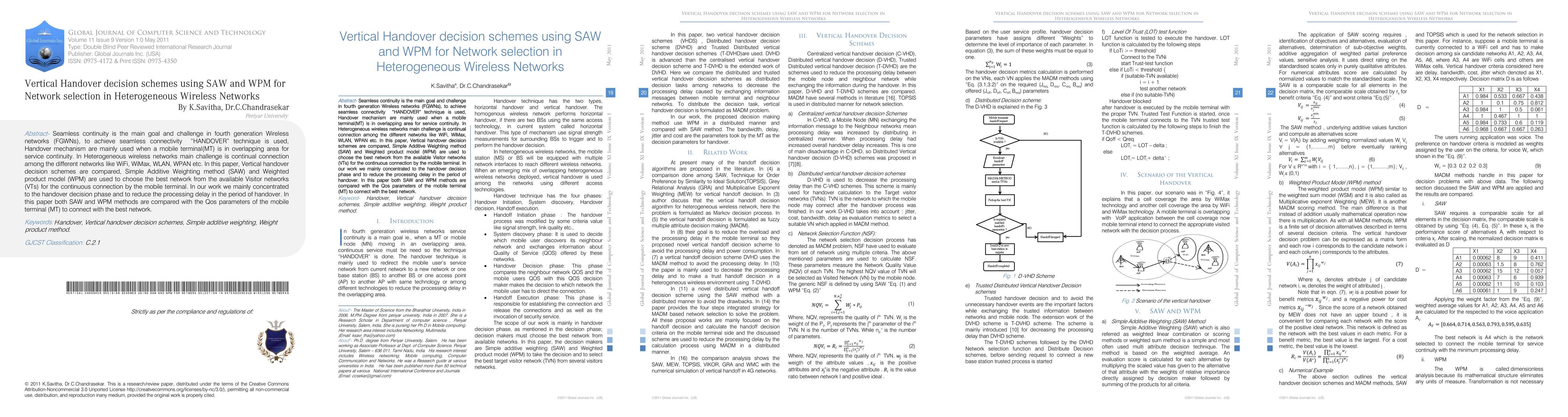 This paper compares vertical handover decision schemes using Simple Additive Weighting (SAW) and Weighted Product Model (WPM) to select the optimal network in heterogeneous wireless networks. The focus is on reducing processing delay during handover and improving connectivity continuity among networks like WiFi and WiMax.