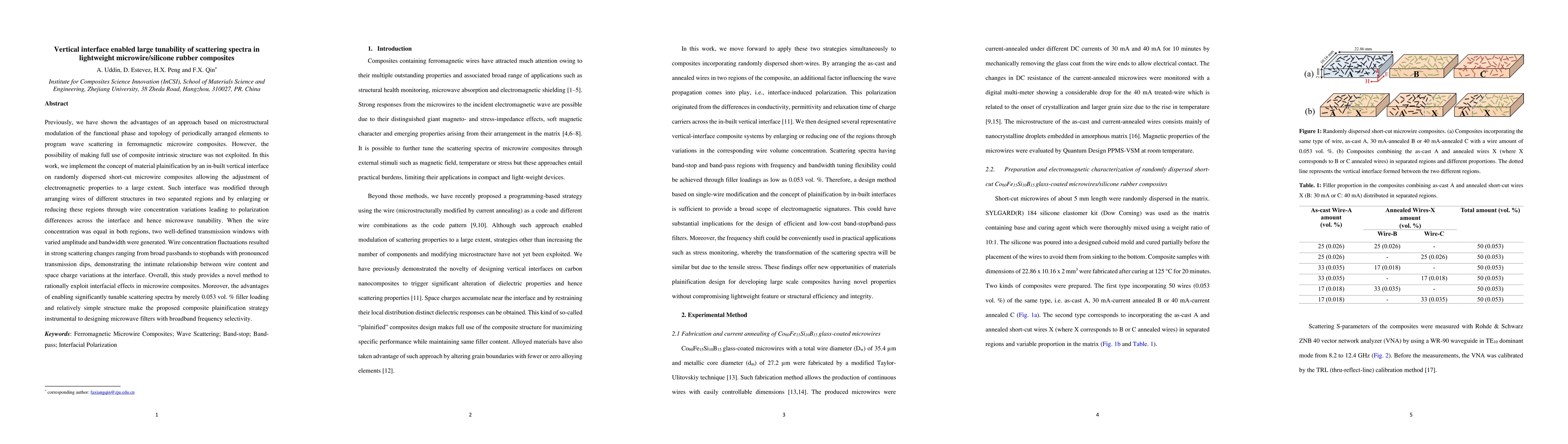 This paper explores the use of vertical interfaces in lightweight microwire/silicone rubber composites to achieve large tunable scattering spectra. By arranging wires differently in two regions and varying their concentration, the study demonstrates significant electromagnetic property modulation, leading to tunable microwave transmission windows and scattering changes.