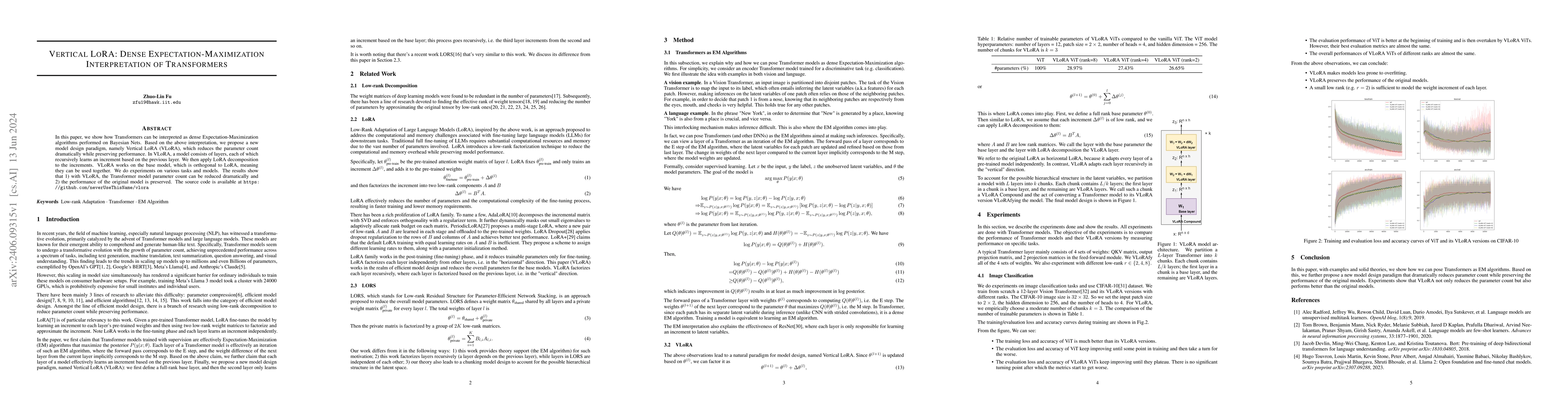 This paper proposes Vertical LoRA (VLoRA), an innovative design paradigm for Transformers that reinterprets them as dense Expectation-Maximization algorithms on Bayesian Nets, significantly reducing parameter count while maintaining performance. Experiments show VLoRA's effectiveness across various tasks.