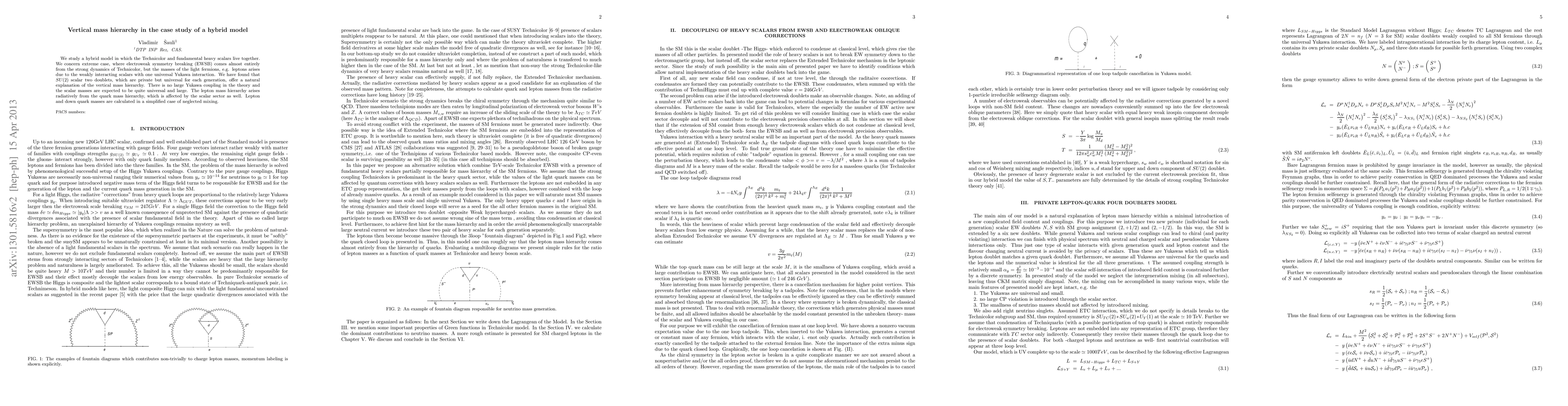 We study a hybrid model in which the Technicolor and fundamental heavy scalars live together. We concern extreme case, where electroweak symmetry breaking (EWSB) comes almost entirely from the strong dynamics of Technicolor, but the masses of the light fermions, e.g. leptons arises due to the weakly interacting scalars with one universal Yukawa interaction. We have found that SU(2) scalar two doublets, which are private but universal for each generation, offer a natural explanation of the vertical mass hierarchy. There is no large Yukawa coupling in the theory and the scalar masses are expected to be quite universal and large. The lepton mass hierarchy arises radiatively from the quark mass hierarchy, which is affected by the scalar sector as well. Lepton and down quark masses are calculated in a simplified case of neglected mixing.