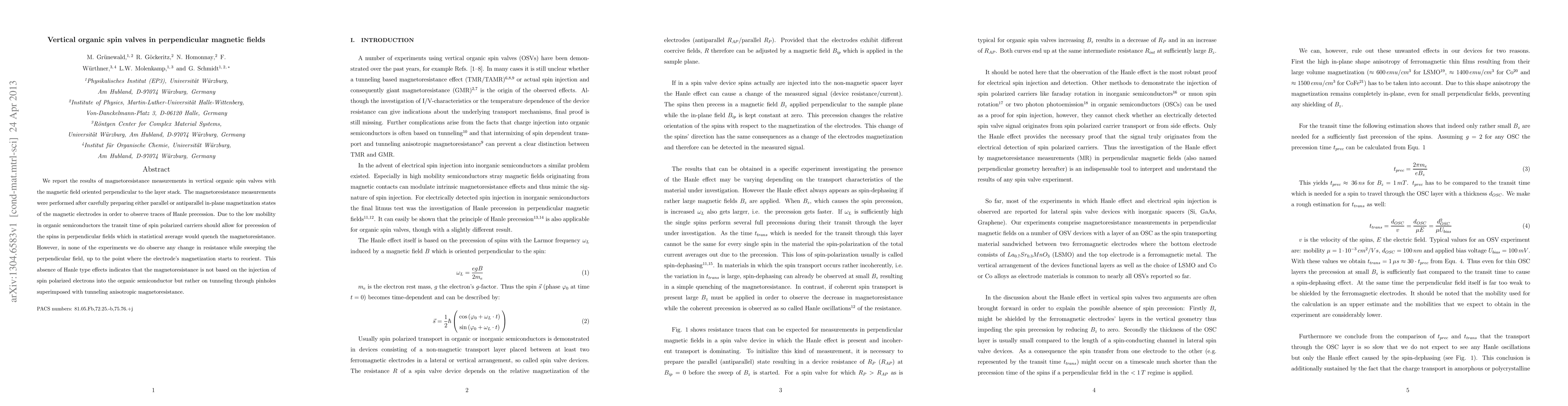This paper investigates vertical organic spin valves under perpendicular magnetic fields, finding no Hanle precession effects despite expected spin precession due to low mobility. Instead, the observed magnetoresistance is attributed to tunneling through pinholes combined with tunneling anisotropic magnetoresistance.