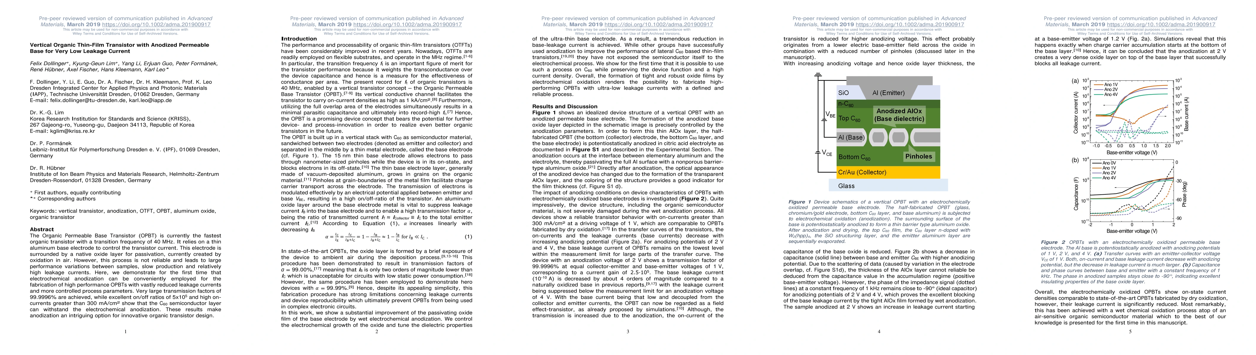 This paper presents a vertical organic thin-film transistor using electrochemically anodized permeable base, achieving very low leakage currents and high performance with a transition frequency of 40 MHz. The anodization method offers more reliable and controlled fabrication compared to traditional oxidation, leading to superior transmission factors and on/off ratios.