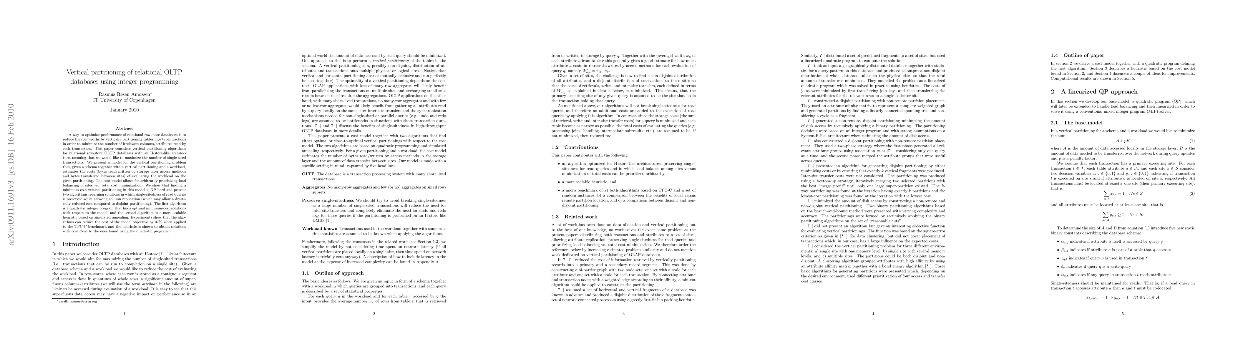 This paper proposes algorithms for vertical partitioning of relational OLTP databases to optimize performance by minimizing irrelevant column reads. The authors present a cost model to estimate the benefits of partitioning and show that finding the optimal solution is NP-hard, proposing both an integer programming approach and a heuristic method to achieve near-optimal results with reduced costs.