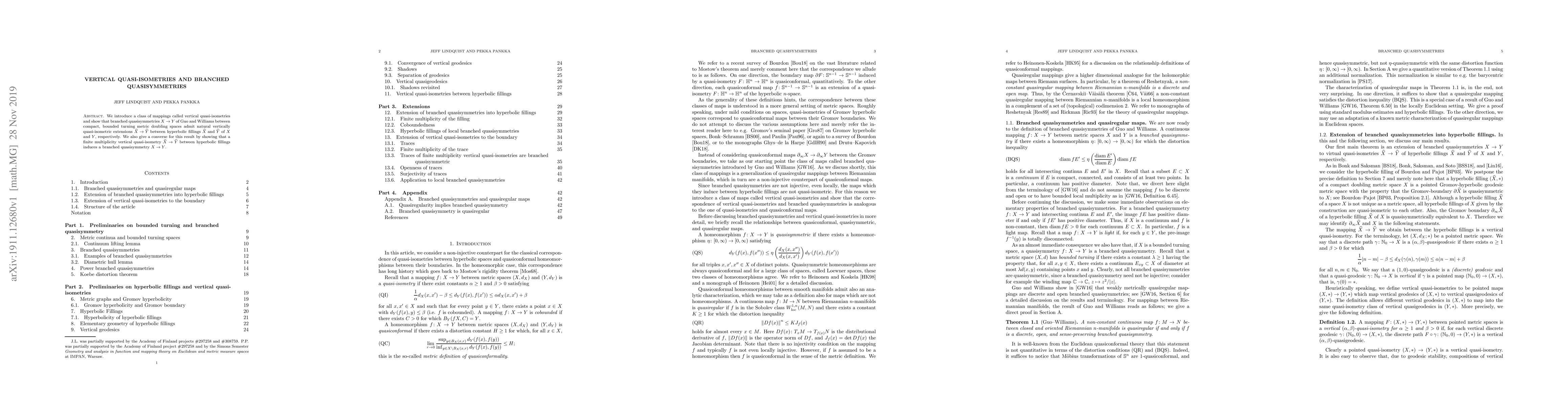 This paper introduces vertical quasi-isometries and demonstrates that branched quasisymmetries between compact metric doubling spaces can be extended to their hyperbolic fillings. Conversely, it shows that a finite multiplicity vertical quasi-isometry between hyperbolic fillings induces a branched quasisymmetry between the original spaces.