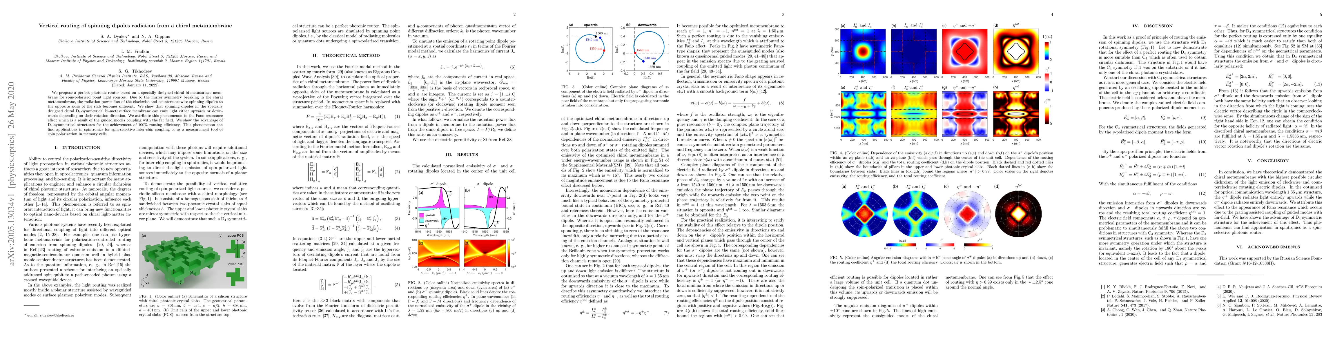 We propose a perfect photonic router based on a specially designed chiral bi-metasurface membrane for spin-polarized point light sources. Due to the mirror symmetry breaking in the chiral metamembrane, the radiation power flux of the clockwise and counterclockwise spinning dipoles to the opposite sides of the slab becomes different. We show that spinning dipoles in the specially designed chiral D$_4$-symmetrical bi-metasurface membrane can emit light either upwards or downwards depending on their rotation direction. We attribute this phenomenon to the Fano-resonance effect which is a result of the guided modes coupling with the far field. We show the advantage of D$_4$-symmetrical structures for the achievement of 100\% routing efficiency. This phenomenon can find applications in spintronics for spin-selective inter-chip coupling or as a measurement tool of spin polarization in memory cells.