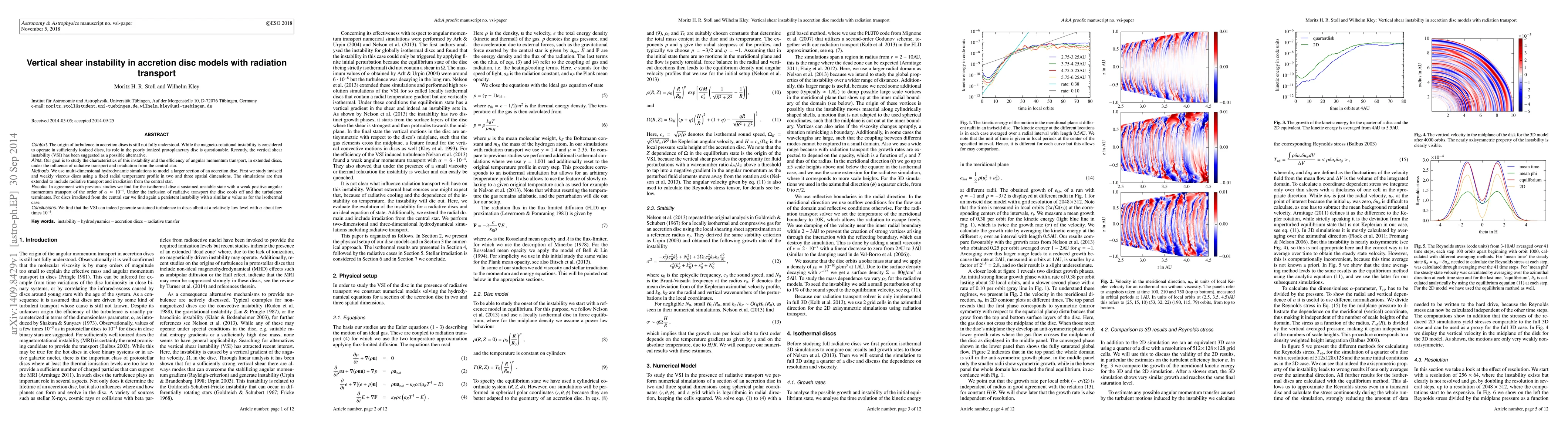 This paper investigates the vertical shear instability (VSI) in accretion discs, focusing on its role in generating turbulence and angular momentum transport. Simulations show VSI can sustain turbulence, albeit weakly, with an $\alpha$ value around $10^{-4}$, but radiative cooling from the central star diminishes this effect.