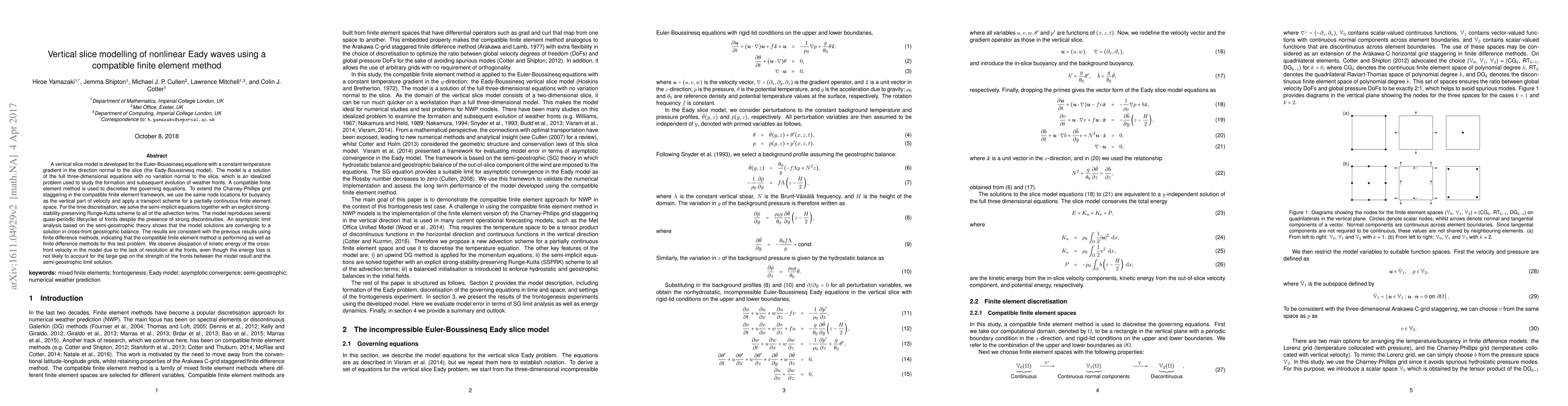 This paper develops a vertical slice model for the Eady-Boussinesq equations using a compatible finite element method to study the formation and evolution of weather fronts. The model successfully reproduces quasi-periodic lifecycles of fronts and converges to a geostrophic balance, showing comparable performance to finite difference methods.