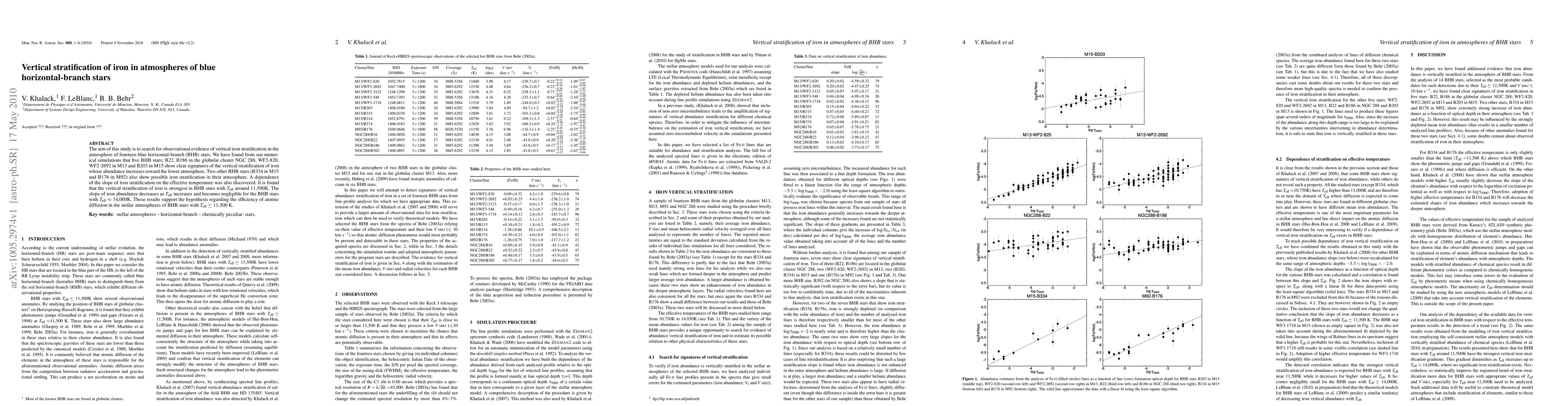 This study investigates the vertical stratification of iron in the atmospheres of fourteen blue horizontal-branch stars, finding that five stars exhibit clear evidence of iron abundance increasing towards the lower atmosphere. The strongest stratification occurs in stars with effective temperatures around 11,500K, supporting the hypothesis of enhanced atomic diffusion in these stars.