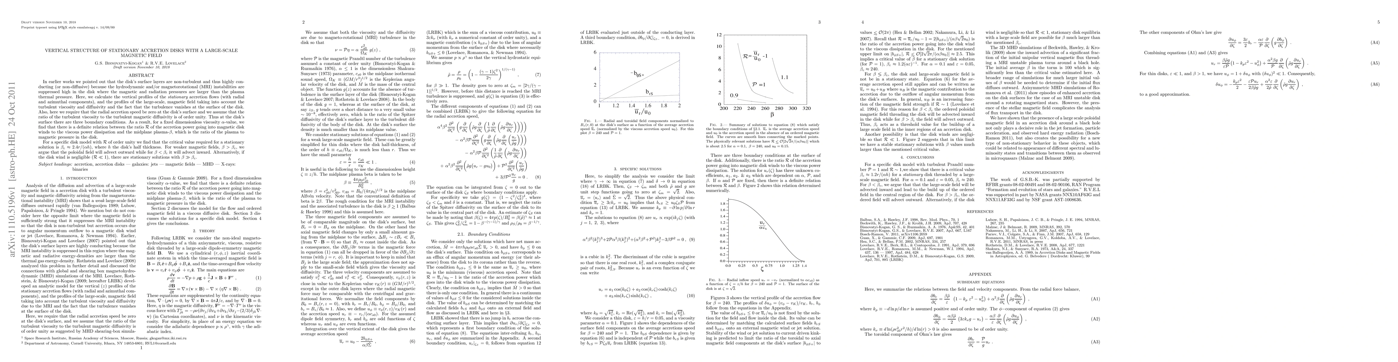 In earlier works we pointed out that the disk's surface layers are non-turbulent and thus highly conducting (or non-diffusive) because the hydrodynamic and/or magnetorotational (MRI) instabilities are suppressed high in the disk where the magnetic and radiation pressures are larger than the plasma thermal pressure. Here, we calculate the vertical profiles of the {\it stationary} accretion flows (with radial and azimuthal components), and the profiles of the large-scale, magnetic field taking into account the turbulent viscosity and diffusivity and the fact that the turbulence vanishes at the surface of the disk. Also, here we require that the radial accretion speed be zero at the disk's surface and we assume that the ratio of the turbulent viscosity to the turbulent magnetic diffusivity is of order unity. Thus at the disk's surface there are three boundary conditions. As a result, for a fixed dimensionless viscosity $\alpha$-value, we find that there is a definite relation between the ratio ${\cal R}$ of the accretion power going into magnetic disk winds to the viscous power dissipation and the midplane plasma-$\beta$, which is the ratio of the plasma to magnetic pressure in the disk. For a specific disk model with ${\cal R}$ of order unity we find that the critical value required for a stationary solution is $\beta_c \approx 2.4r/(\alpha h)$, where $h$ the disk's half thickness. For weaker magnetic fields, $\beta > \beta_c$, we argue that the poloidal field will advect outward while for $\beta< \beta_c$ it will advect inward. Alternatively, if the disk wind is negligible (${\cal R} \ll 1$), there are stationary solutions with $\beta \gg \beta_c$.