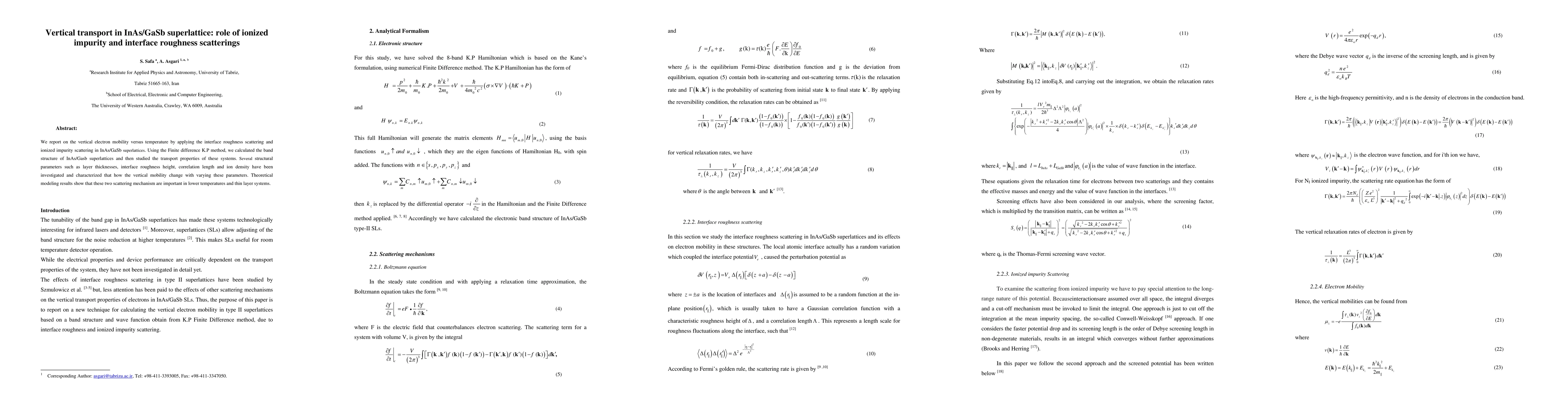 We report on the vertical electron mobility versus temperature by applying the interface roughness scattering and ionized impurity scattering in InAs/GaSb superlattices. Using the Finite difference K.P method, we calculated the band structure of InAs/Gasb superlattices and then studied the transport properties of these systems. Several structural parameters such as layer thicknesses, interface roughness height, correlation length and ion density have been investigated and characterized that how the vertical mobility change with varying these parameters. Theoretical modeling results show that these two scattering mechanism are important in lower temperatures and thin layer systems.
