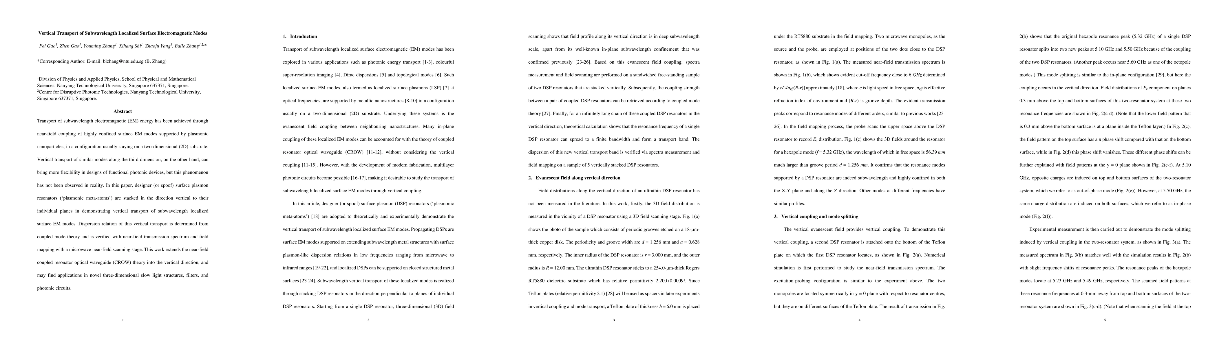 This paper demonstrates vertical transport of subwavelength localized surface electromagnetic modes using stacked designer surface plasmon resonators, extending near-field coupled resonator optical waveguide theory into the third dimension. The dispersion relation is confirmed via coupled mode theory and verified with microwave near-field scanning, suggesting potential for advanced 3D photonic devices.