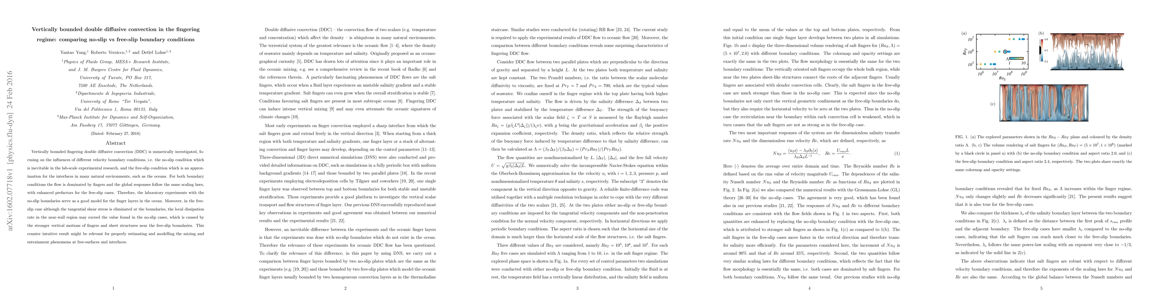 This paper investigates numerically the vertically bounded double diffusive convection under no-slip and free-slip boundary conditions, finding that both conditions yield fingering patterns governed by similar scaling laws, though free-slip conditions lead to higher local dissipation rates due to stronger vertical finger motions.