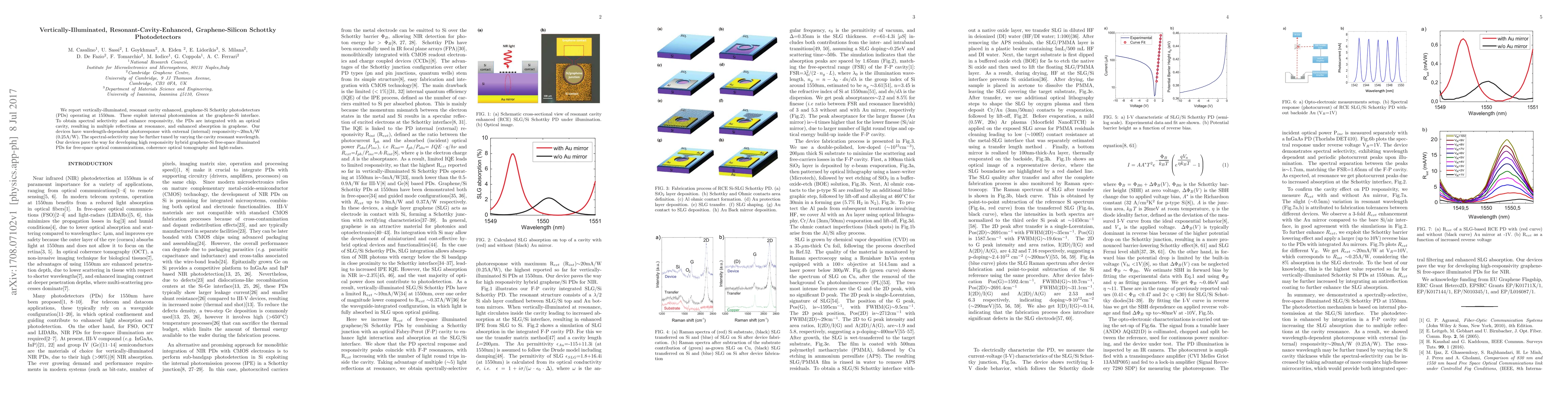 This paper presents vertically-illuminated, resonant cavity-enhanced graphene-Si Schottky photodetectors operating at 1550nm, achieving high responsivity through internal photoemission and cavity resonance, with potential applications in optical communications and imaging technologies.