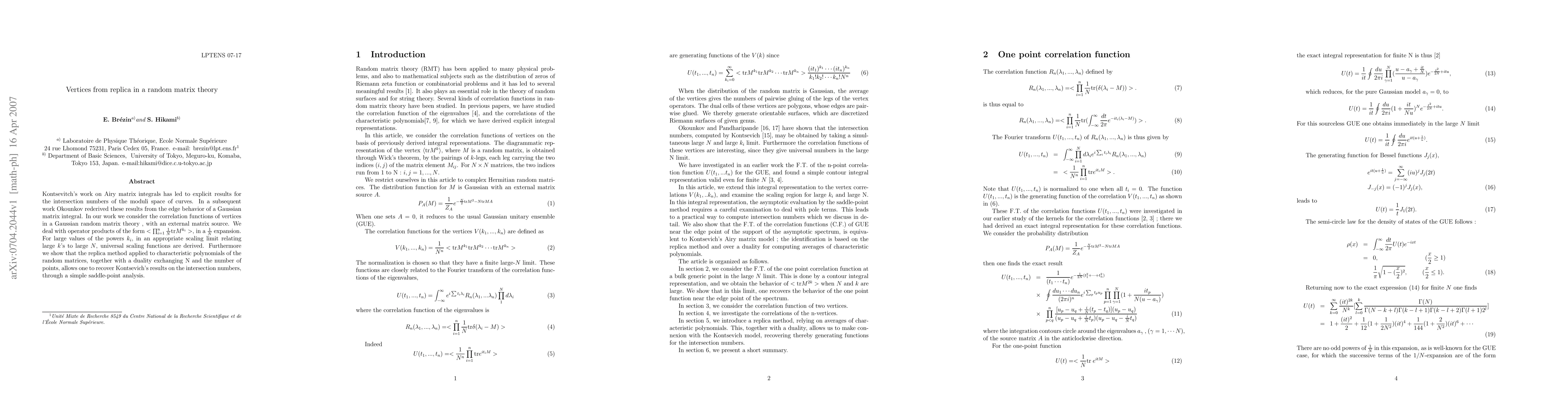 Kontsevitch's work on Airy matrix integrals has led to explicit results for the intersection numbers of the moduli space of curves. In a subsequent work Okounkov rederived these results from the edge behavior of a Gaussian matrix integral. In our work we consider the correlation functions of vertices in a Gaussian random matrix theory, with an external matrix source, in a scaling limit in which the powers of the matrices and their sizes go to infinity simultaneously in a specified scale. We show that the replica method applied to characteristic polynomials of the random matrices, together with a duality exchanging N and the number of points, allows one to recover Kontsevich's results on the intersection numbers, through a simple saddle-point analysis.