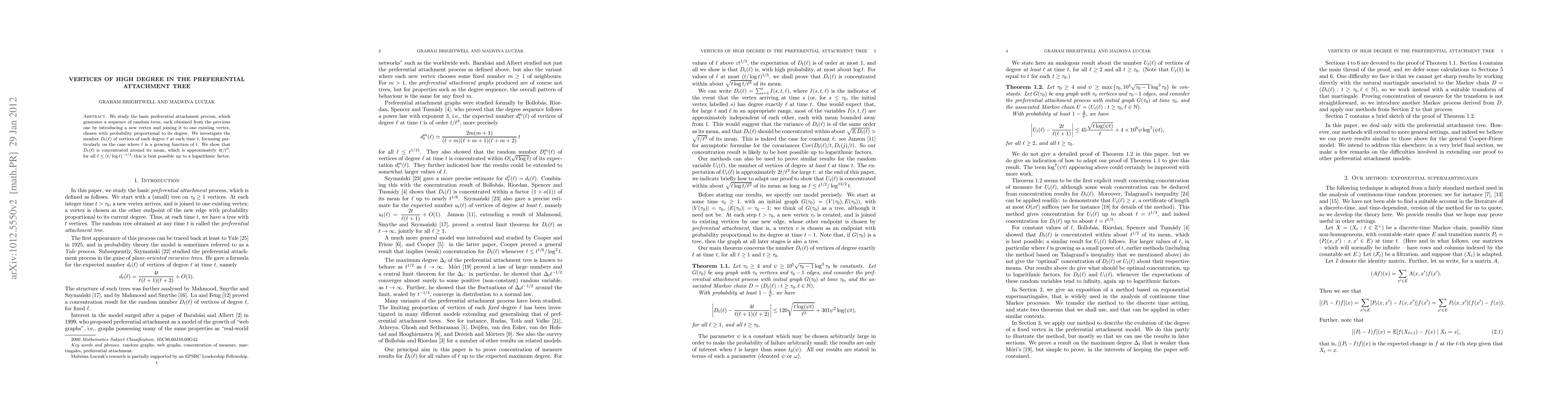Researchers investigate how vertices of high degree appear in trees generated by a preferential attachment process, finding that their numbers are concentrated around a mean value of approximately 4t/ell^3 for small ell.