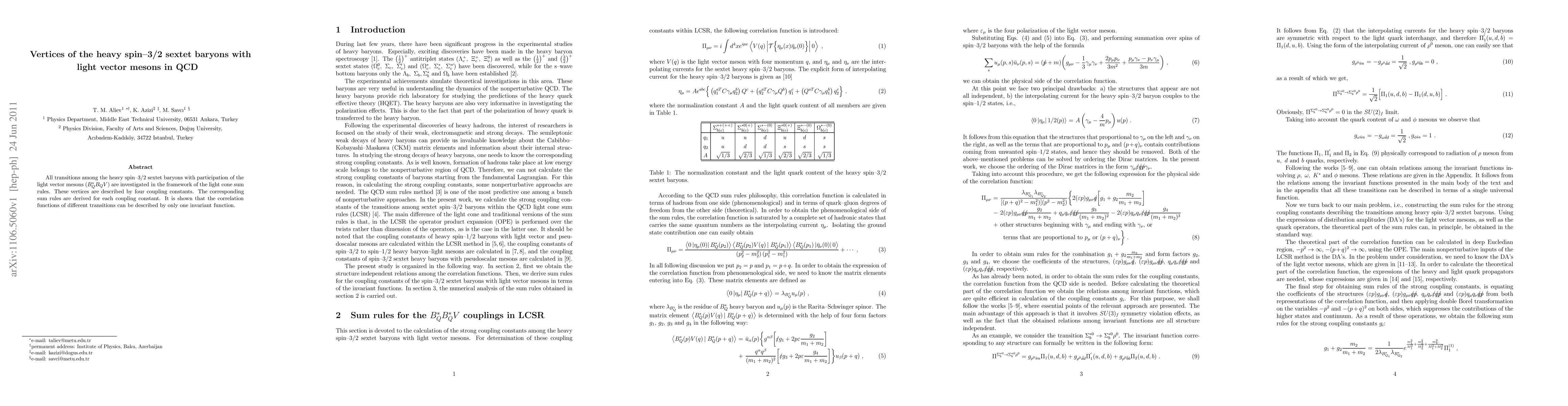 All transitions among the heavy spin--3/2 sextet baryons with participation of the light vector mesons $(B_Q^* B_Q V)$ are investigated in the framework of the light cone sum rules. These vertices are described by four coupling constants. The corresponding sum rules are derived for each coupling constant. It is shown that the correlation functions of different transitions can be described by only one invariant function.