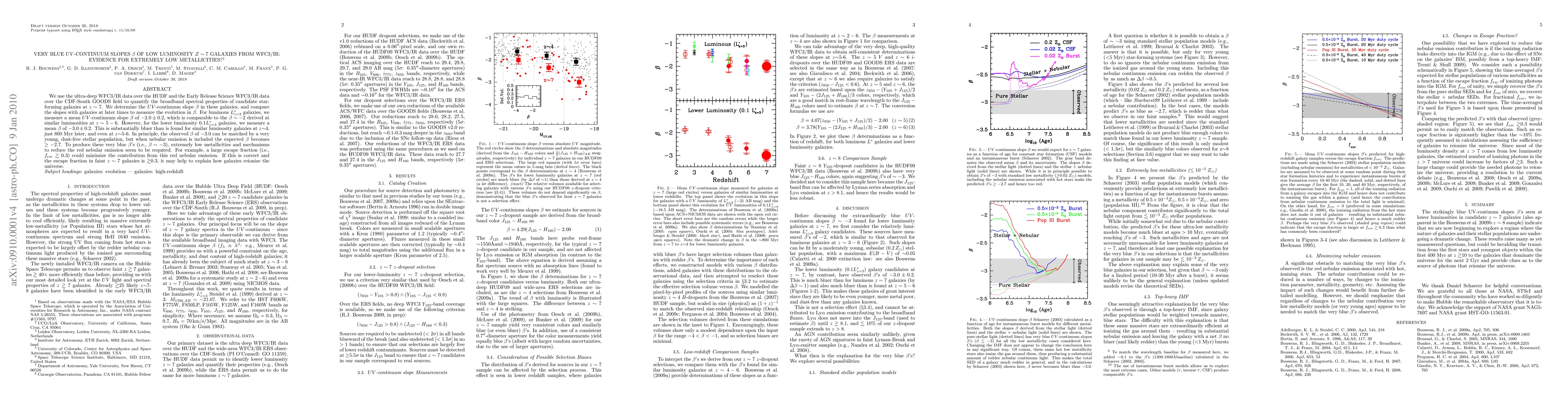 This paper analyzes the UV-continuum slopes of low luminosity z~7 galaxies using WFC3/IR data, finding very blue slopes of beta~-3. This suggests extremely low metallicities and mechanisms to reduce red nebular emission, potentially indicating high escape fractions of ionizing photons.