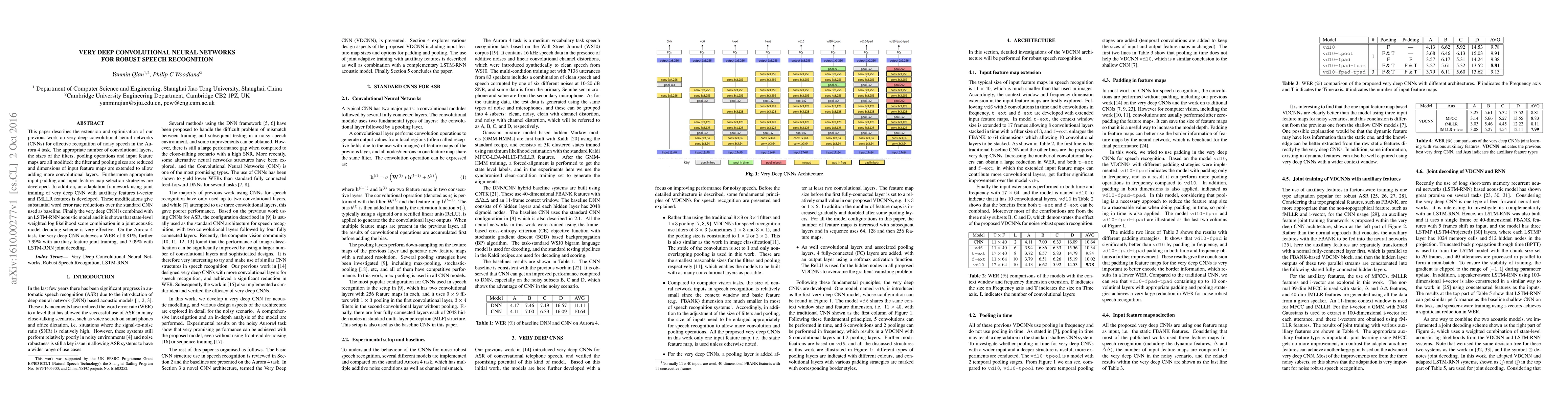 This paper optimizes very deep convolutional neural networks (CNNs) for robust speech recognition, achieving significant word error rate reductions through modifications in filter sizes, pooling operations, and input feature maps. The integration of auxiliary features and LSTM-RNN models further enhances performance, achieving a WER of 8.81% on the Aurora 4 task.