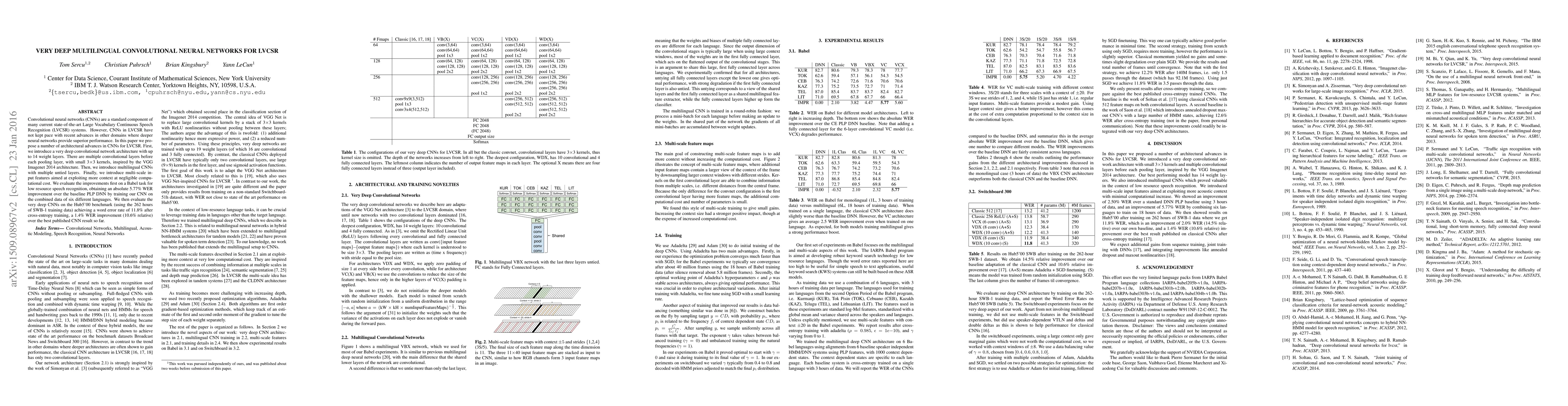 This paper proposes advanced deep convolutional neural network architectures for Large Vocabulary Continuous Speech Recognition (LVCSR), achieving significant improvements over baseline models. The authors introduce a very deep network with up to 14 layers, multilingual CNNs, and multi-scale input features, resulting in notable reductions in Word Error Rates (WER) on both low-resource Babel tasks and the Hub5'00 benchmark.