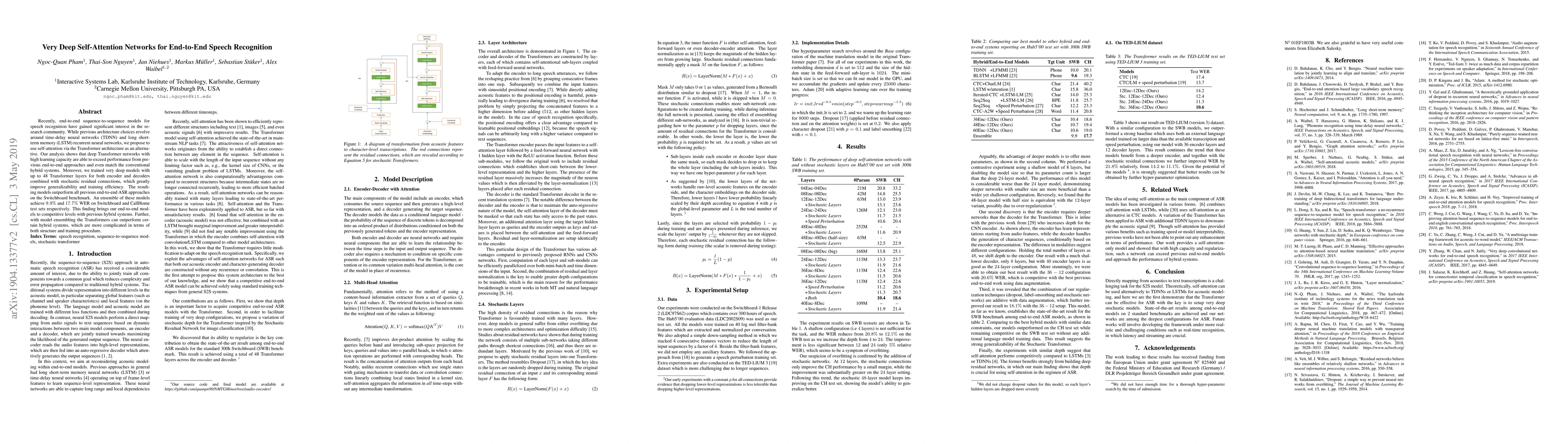 This paper presents very deep Transformer networks with self-attention for end-to-end speech recognition, achieving superior performance compared to previous models and hybrid systems, especially when using model ensembling. The deep Transformer architecture with stochastic residual connections enhances training efficiency and generalizability.