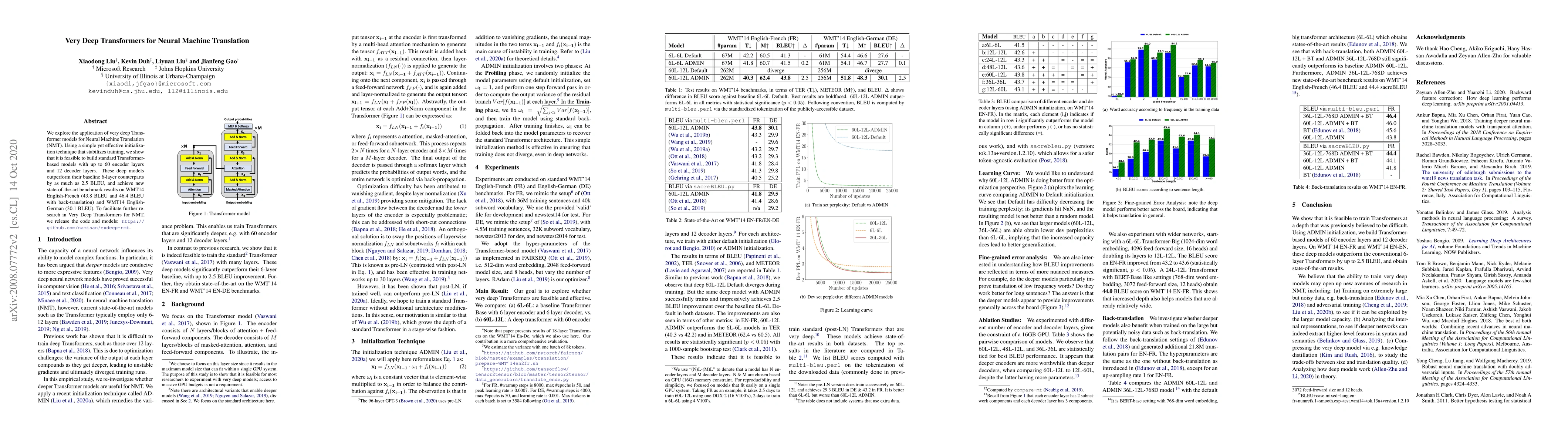 This paper investigates the use of very deep Transformer models for Neural Machine Translation, achieving up to 60 encoder layers and 12 decoder layers. These deep models significantly improve translation quality, achieving new state-of-the-art results on WMT14 English-French and English-German datasets.