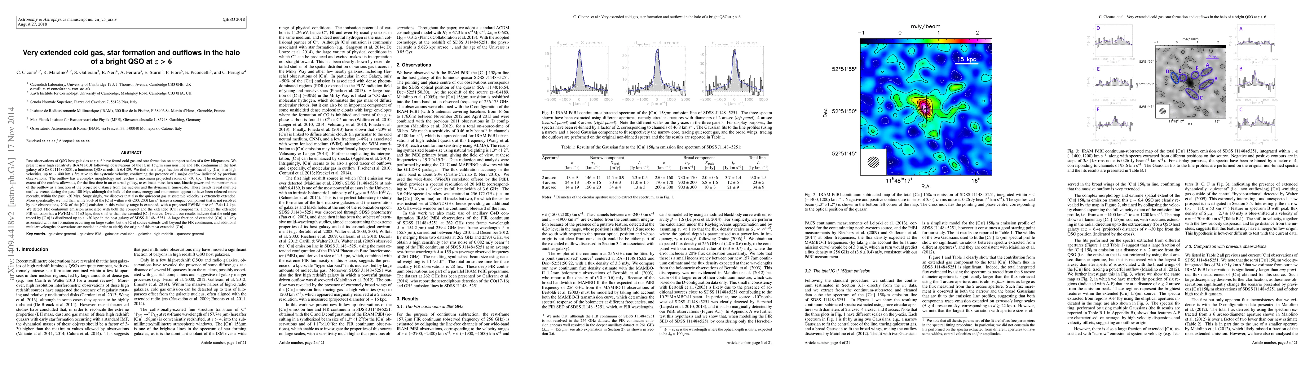 Past observations of QSO host galaxies at z >6 have found cold gas and star formation on compact scales of a few kiloparsecs. We present new high sensitivity IRAM PdBI follow-up observations of the [CII] 158micron emission line and FIR continuum in the host galaxy of SDSS J1148+5152, a luminous QSO at redshift 6.4189. We find that a large fraction of the gas traced by [CII] is at high velocities, up to ~1400 km/s relative to the systemic velocity, confirming the presence of a major quasar-driven outflow indicated by previous observations. The outflow has a complex morphology and reaches a maximum projected radius of ~30 kpc. The extreme spatial extent of the outflow allows us, for the first time in an external galaxy, to estimate mass-loss rate, kinetic power and momentum rate of the outflow as a function of the projected distance from the nucleus and the dynamical time-scale. These trends reveal multiple outflow events during the past 100 Myr, although the bulk of the mass, energy and momentum appear to have been released more recently, within the past ~20 Myr. Surprisingly, we discover that also the quiescent gas at systemic velocity is extremely extended. More specifically, we find that, while 30% of the [CII] within v\in(-200, 200) km/s traces a compact component that is not resolved by our observations, 70% of the [CII] emission in this velocity range is extended, with a projected FWHM size of 17.4+-1.4 kpc. We detect FIR continuum emission associated with both the compact and the extended [CII] components, although the extended FIR emission has a FWHM of 11+-3 kpc, thus smaller than the extended [CII] source. Overall, our results indicate that the cold gas traced by [CII] is distributed up to r~30 kpc. A large fraction of extended [CII] is likely associated with star formation on large scales, but the [CII] source extends well beyond the FIR continuum.