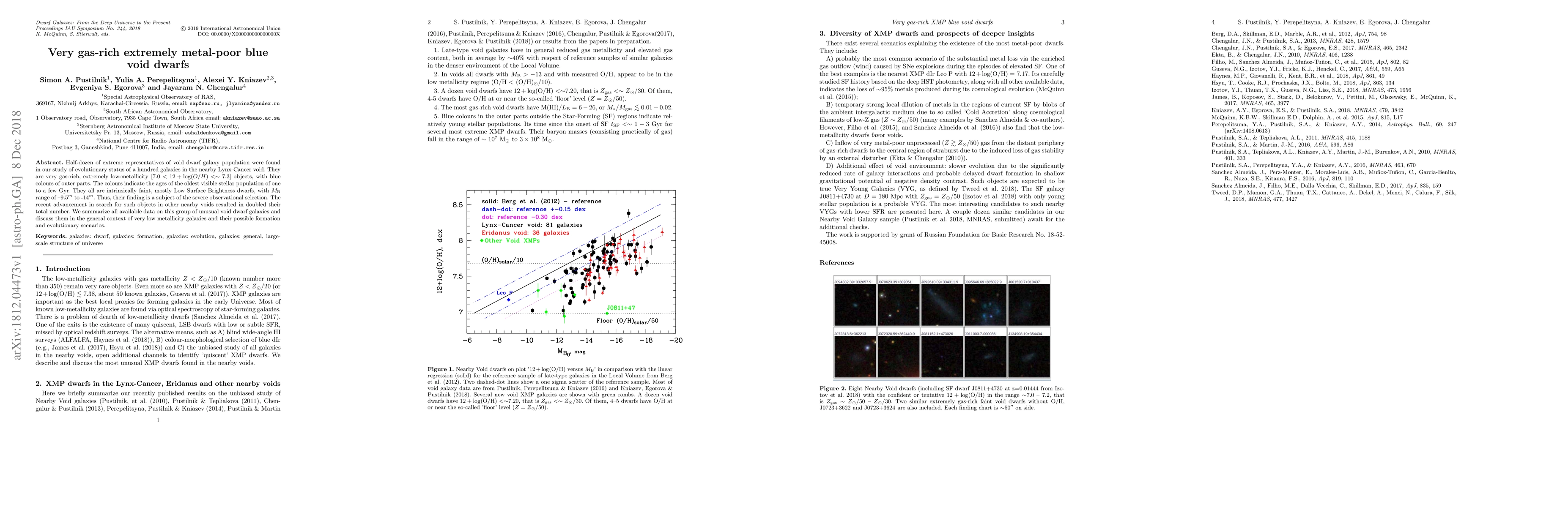 Half-dozen of extreme representatives of void dwarf galaxy population were found in our study of evolutionary status of a hundred galaxies in the nearby Lynx-Cancer void. They are very gas-rich, extremely low-metallicity [7.0 < 12+log(O/H)< ~7.3] objects, with blue colours of outer parts. The colours indicate the ages of the oldest visible stellar population of one to a few Gyr. They all are intrinsically faint, mostly Low Surface Brightness dwarfs, with M_B range of -9.5 to -14 mag. Thus, their finding is a subject of the severe observational selection. The recent advancement in search for such objects in other nearby voids resulted in doubled their total number. We summarize all available data on this group of unusual void dwarf galaxies and discuss them in the general context of very low metallicity galaxies and their possible formation and evolutionary scenarios.