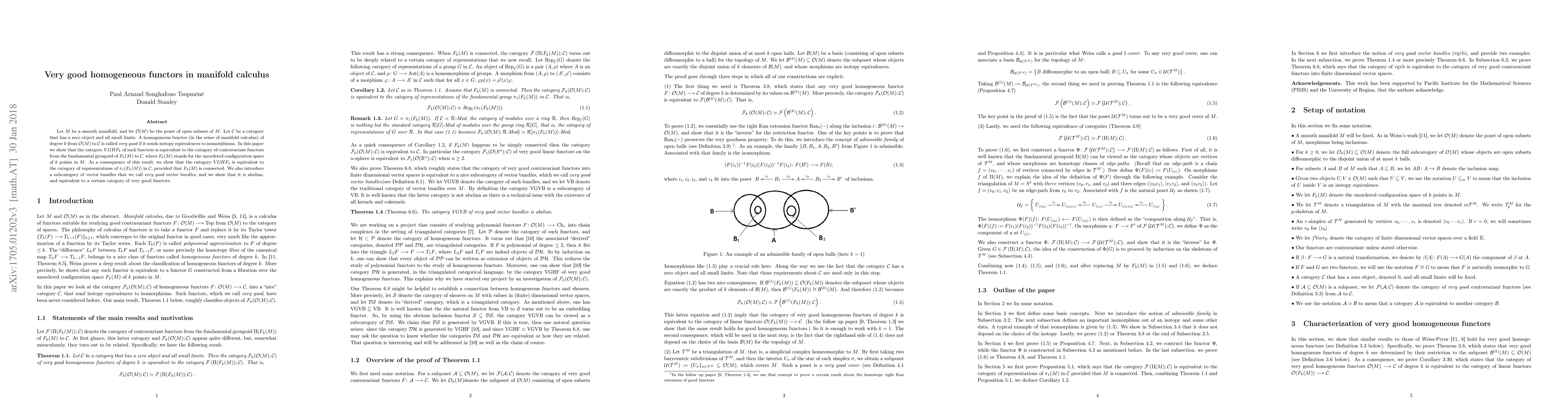 This paper investigates very good homogeneous functors in manifold calculus, proving that the category of such functors is equivalent to contravariant functors from the fundamental groupoid of the configuration space of k points in a manifold M to another category C. Additionally, it establishes the equivalence of this category to representations of the fundamental group of the configuration space, given connectivity. The paper also introduces very good vector bundles, demonstrating they form an abelian category equivalent to a specific category of very good functors.