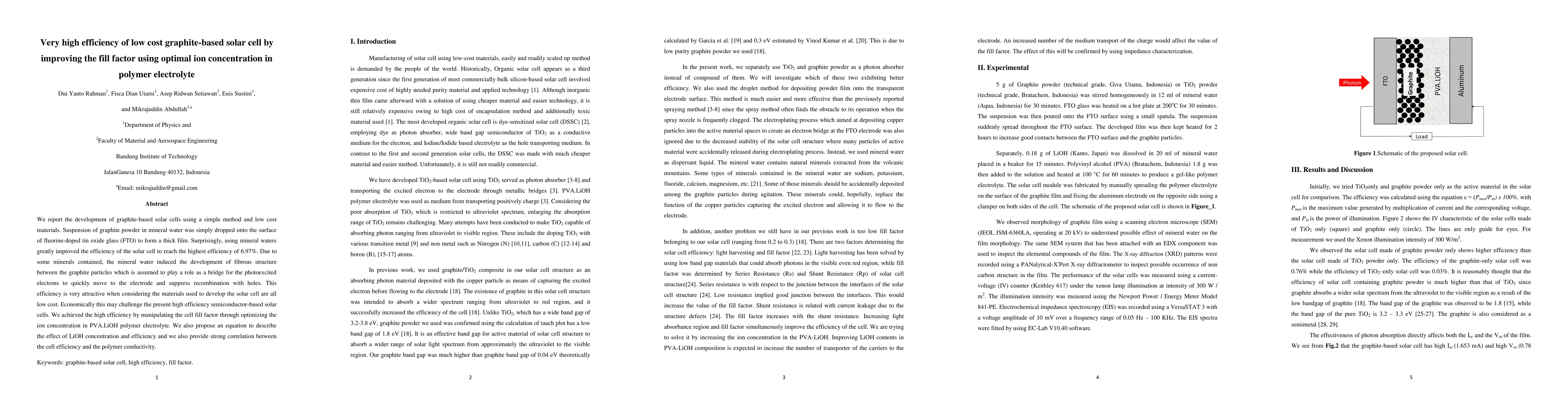 This paper details the creation of low-cost graphite-based solar cells with high efficiency (6.97%) achieved by using mineral water to form a fibrous structure between graphite particles, enhancing electron mobility. The researchers improved the fill factor by optimizing ion concentration in PVA.LiOH polymer electrolyte, challenging the efficiency of conventional semiconductor-based solar cells.