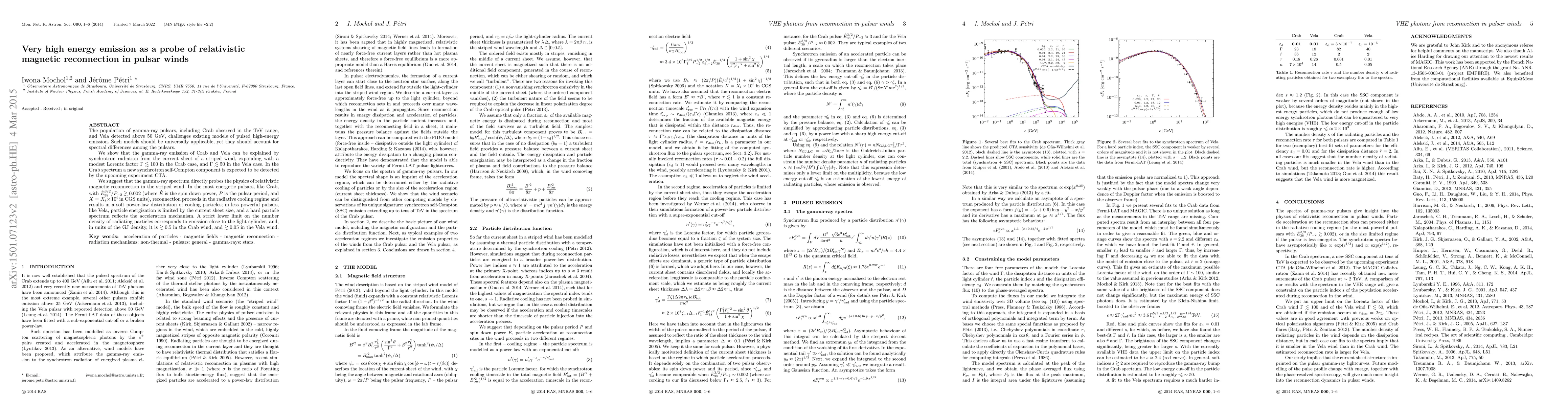 The population of gamma-ray pulsars, including Crab observed in the TeV range, and Vela detected above 50 GeV, challenges existing models of pulsed high-energy emission. Such models should be universally applicable, yet they should account for spectral differences among the pulsars. We show that the gamma-ray emission of Crab and Vela can be explained by synchrotron radiation from the current sheet of a striped wind, expanding with a modest Lorentz factor $\Gamma\lesssim100$ in the Crab case, and $\Gamma\lesssim50$ in the Vela case. In the Crab spectrum a new synchrotron self-Compton component is expected to be detected by the upcoming experiment CTA. We suggest that the gamma-ray spectrum directly probes the physics of relativistic magnetic reconnection in the striped wind. In the most energetic pulsars, like Crab, with $\dot{E}_{38}^{3/2}/P_{-2}\gtrsim0.002$ (where $\dot{E}$ is the spin down power, $P$ is the pulsar period, and $X=X_i\times10^i$ in CGS units), reconnection proceeds in the radiative cooling regime and results in a soft power-law distribution of cooling particles; in less powerful pulsars, like Vela, particle energization is limited by the current sheet size, and a hard particle spectrum reflects the acceleration mechanism. A strict lower limit on the number density of radiating particles corresponds to emission close to the light cylinder, and, in units of the GJ density, it is $\gtrsim0.5$ in the Crab wind, and $\gtrsim0.05$ in the Vela wind.