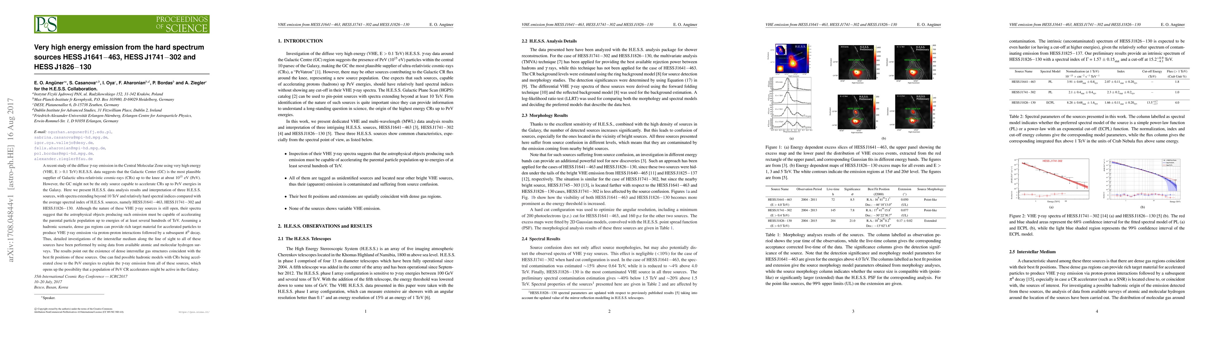 A recent study of the diffuse $\gamma$-ray emission in the Central Molecular Zone using very high energy (VHE, E $>$ 0.1 TeV) H.E.S.S. data suggests that the Galactic Center (GC) is the most plausible supplier of Galactic ultra-relativistic cosmic-rays (CRs) up to the knee at about 10$^{15}$ eV (PeV). However, the GC might not be the only source capable to accelerate CRs up to PeV energies in the Galaxy. Here we present H.E.S.S. data analysis results and interpretation of three H.E.S.S. sources, with spectra extending beyond 10 TeV and relatively hard spectral indices compared with the average spectral index of H.E.S.S. sources, namely HESS J1641-463, HESS J1741-302 and HESS J1826-130. Although the nature of these VHE $\gamma$-ray sources is still open, their spectra suggest that the astrophysical objects producing such emission must be capable of accelerating the parental particle population up to energies of at least several hundreds of TeV. Assuming a hadronic scenario, dense gas regions can provide rich target material for accelerated particles to produce VHE $\gamma$-ray emission via proton-proton interactions followed by a subsequent $\pi^{0}$ decay. Thus, detailed investigations of the interstellar medium along the line of sight to all of these sources have been performed by using data from available atomic and molecular hydrogen surveys. The results point out the existence of dense interstellar gas structures coincident with the best fit positions of these sources. One can find possible hadronic models with CRs being accelerated close to the PeV energies to explain the $\gamma$-ray emission from all of these sources, which opens up the possibility that a population of PeV CR accelerators might be active in the Galaxy.