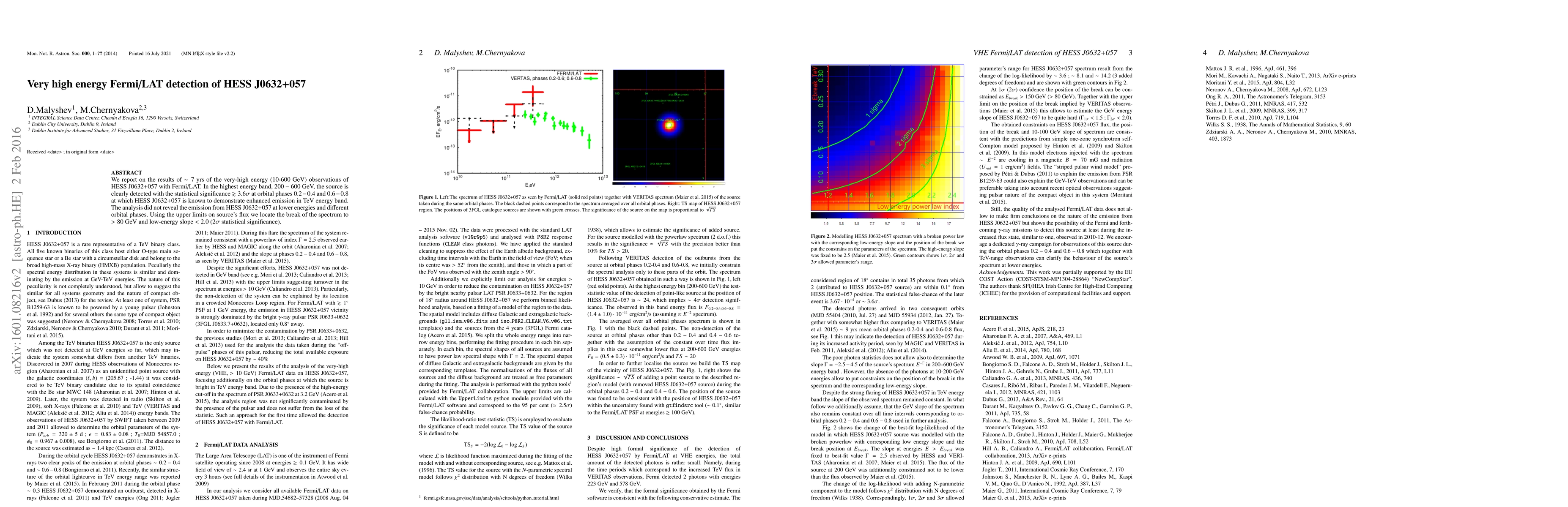 The Fermi/LAT detected HESS J0632+057 at very high energies (200-600 GeV) with >3.6σ significance during specific orbital phases, while no emission was found at lower energies or different phases. The spectrum's break is estimated to be >80 GeV with a low-energy slope <2.0.