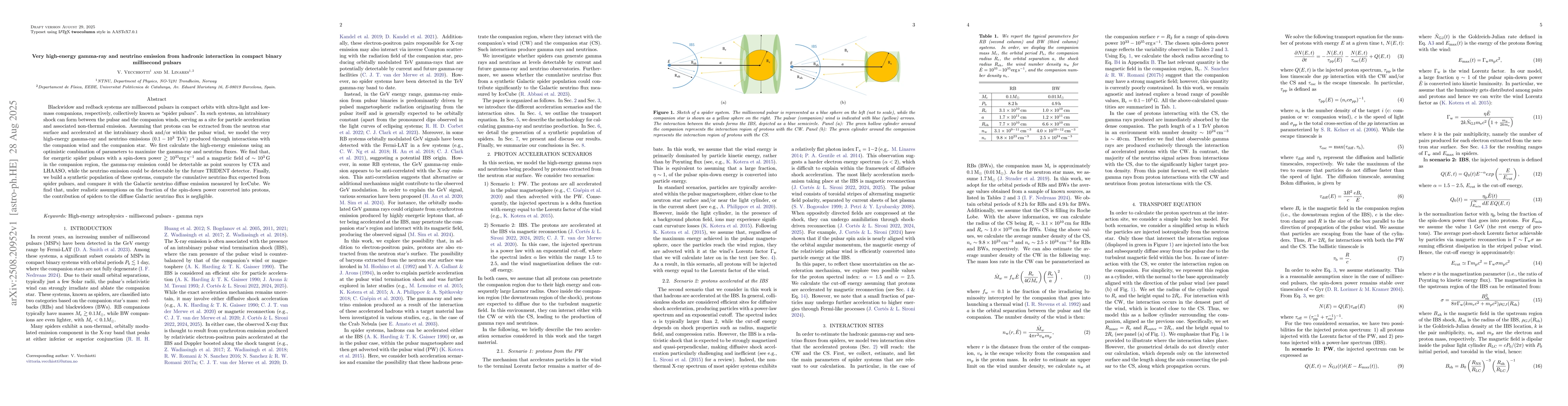 Blackwidow and redback systems are millisecond pulsars in compact orbits with ultra-light and low-mass companions, respectively, collectively known as ``spider pulsars". In such systems, an intrabinary shock can form between the pulsar and the companion winds, serving as a site for particle acceleration and associated non-thermal emission. Assuming that protons can be extracted from the neutron star surface and accelerated at the intrabinary shock and/or within the pulsar wind, we model the very high-energy gamma-ray and neutrino emissions ($0.1-10^3$~TeV) produced through interactions with the companion wind and the companion star. We first calculate the high-energy emissions using an optimistic combination of parameters to maximize the gamma-ray and neutrino fluxes. We find that, for energetic spider pulsars with a spin-down power $\gtrsim 10^{35}\rm erg\, s^{-1}$ and a magnetic field of $\sim 10^{3}\, \rm G$ in the companion region, the gamma-ray emission could be detectable as point sources by CTA and LHAASO, while the neutrino emission could be detectable by the future TRIDENT detector. Finally, we build a synthetic population of these systems, compute the cumulative neutrino flux expected from spider pulsars, and compare it with the Galactic neutrino diffuse emission measured by IceCube. We find that, under realistic assumptions on the fraction of the spin-down power converted into protons, the contribution of spiders to the diffuse Galactic neutrino flux is negligible.