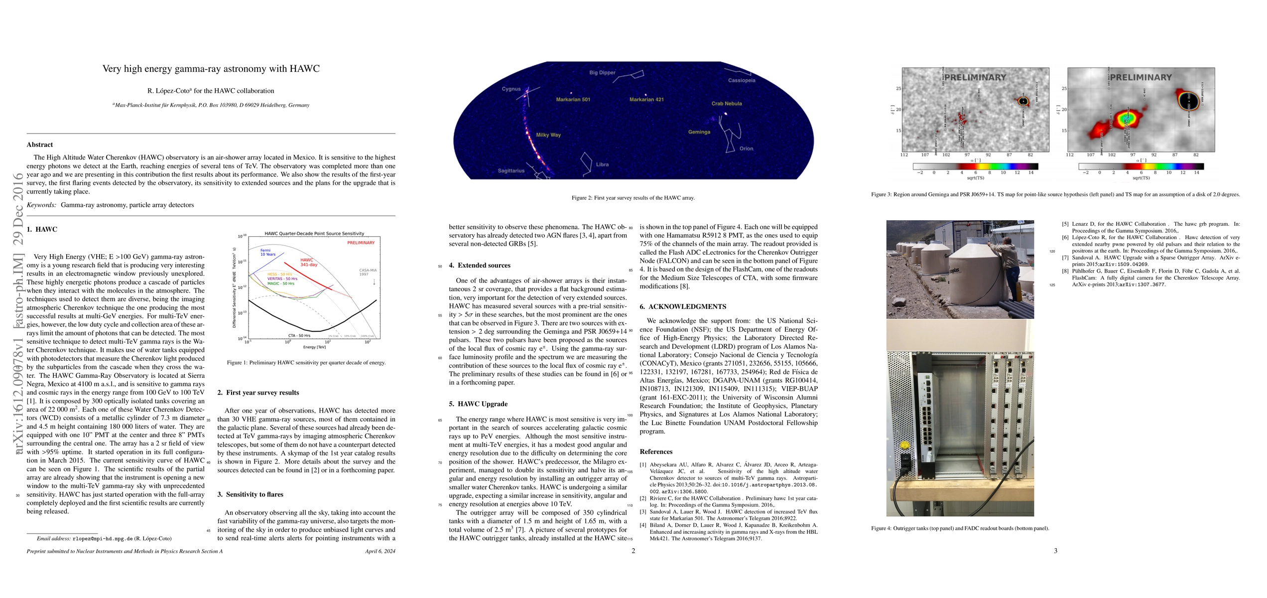 The High Altitude Water Cherenkov (HAWC) observatory is an air-shower array located in Mexico. It is sensitive to the highest energy photons we detect at the Earth, reaching energies of several tens of TeV. The observatory was completed more than one year ago and we are presenting in this contribution the first results about its performance. We also show the results of the first-year survey, the first flaring events detected by the observatory, its sensitivity to extended sources and the plans for the upgrade that is currently taking place.