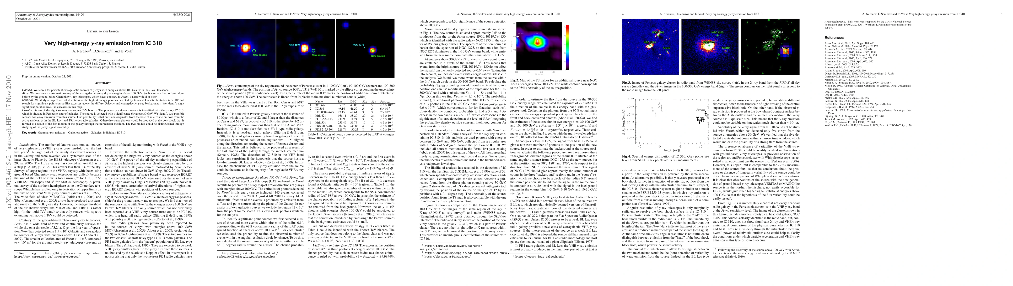 We construct a systematic survey of extragalactic \gamma-ray sky at the energies above 100 GeV using the data of Fermi telescope. Such survey has not been previously done by the ground-based Cherenkov gamma-ray telescopes which have, contrary to Fermi, narrow field of view. We study a map of arrival directions of the highest energy photons detected by Fermi at Galactic latitudes |b| > 10 degrees and search for significant point source like excesses above the diffuse Galactic and extragalactic \gamma-ray backgrounds. We identify eight significant point source like excesses in this map. Seven of the eight sources are known TeV blazars. The previously unknown source is identified with a head-tail radio galaxy IC 310, situated in Perseus cluster of galaxies. The source is detected with significance 6 sigma above 30 GeV. We identify two possible scenaria for gamma-ray emission from this source. One possibility is that emission originates from the base of relativistic outflow from the active nucleus, as in the BL Lacs and FR I type radio galaxies. Otherwise gamma-ray photons could be produced at the bow shock formed in result of fast motion of the galaxy through the intracluster medium. The two models could be distinguished via the study of variability of the \gamma-ray signal.