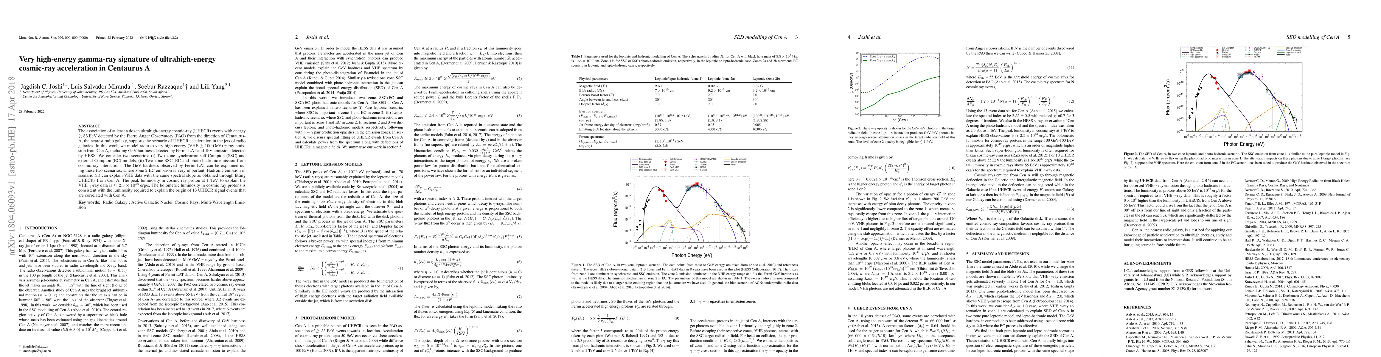 This paper investigates the gamma-ray emission from Centaurus A, modeling its radio to very high-energy spectrum to explain the GeV and TeV emissions. The study supports UHECR acceleration in the galaxy's jets, with photo-hadronic interactions providing a consistent explanation for the observed VHE gamma-ray data and the origin of correlated UHECR events.
