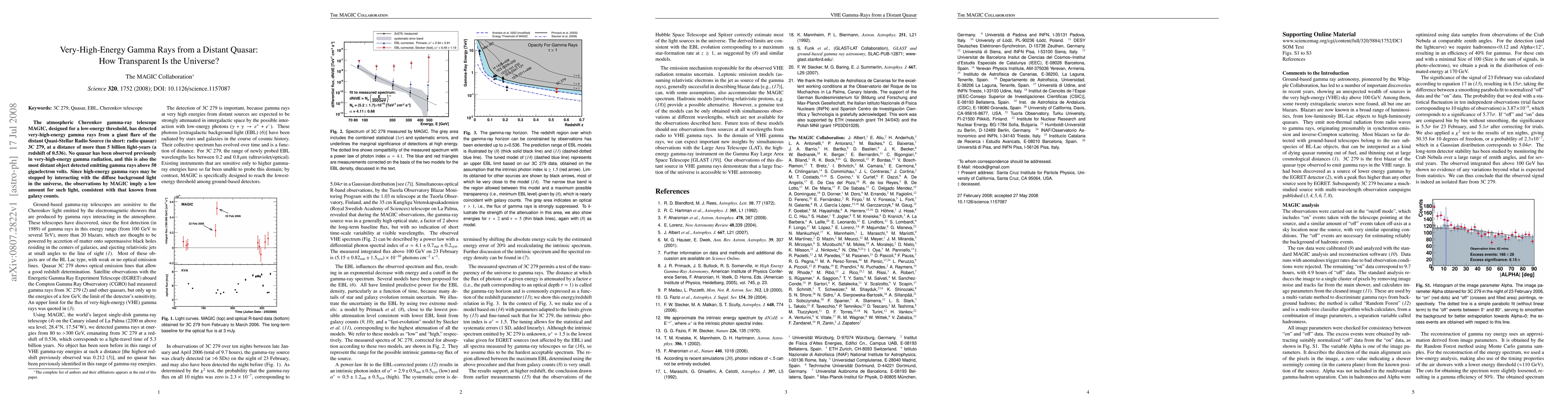 The MAGIC telescope detected very-high-energy gamma rays from the distant quasar 3C 279, indicating minimal interaction with the universe's background light, suggesting a transparent universe for such radiation. This observation marks the first detection of quasars in very-high-energy gamma radiation and confirms the low density of diffuse background light.