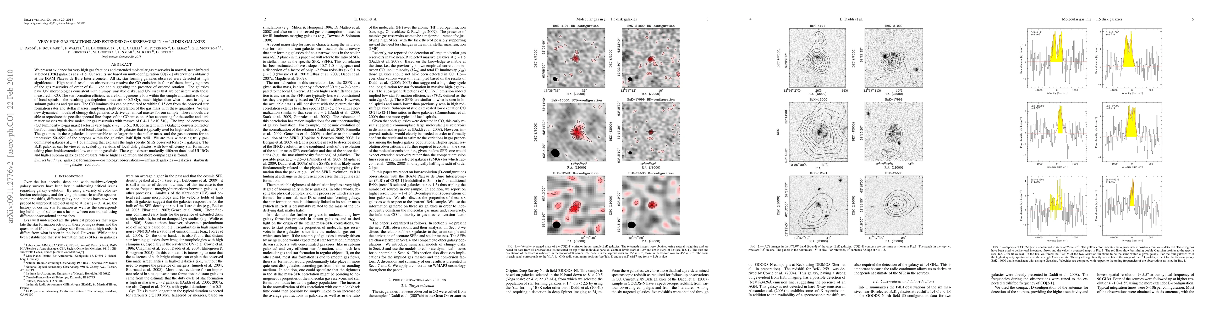 This paper reports high gas fractions and extended molecular gas reservoirs in z~1.5 disk galaxies, revealing gas-dominated galaxies with low star formation efficiencies. The gas accounts for 50-65% of baryons within the galaxies' half light radii, suggesting these galaxies are fundamentally different from local ultra-luminous IR galaxies and high-z submm galaxies.